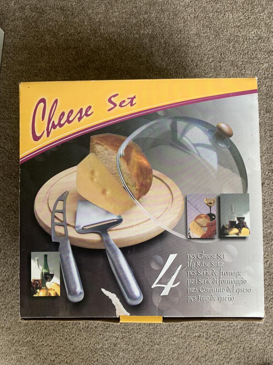 4 piece cheese set, still in box. Glass dome lid with brushed stainless slicer & knife. Excellent gift.
