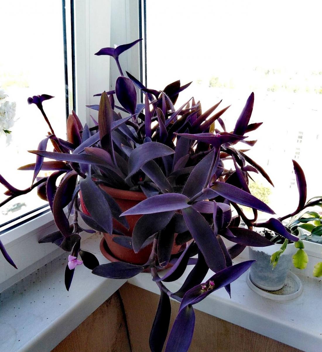 (Latin Name - Tradescantia pallida), with dainty pink flower.