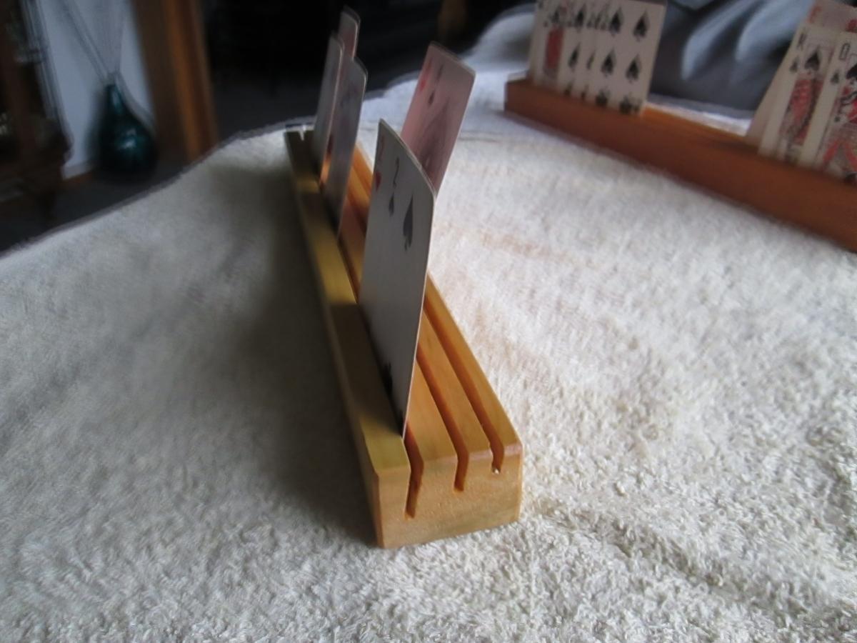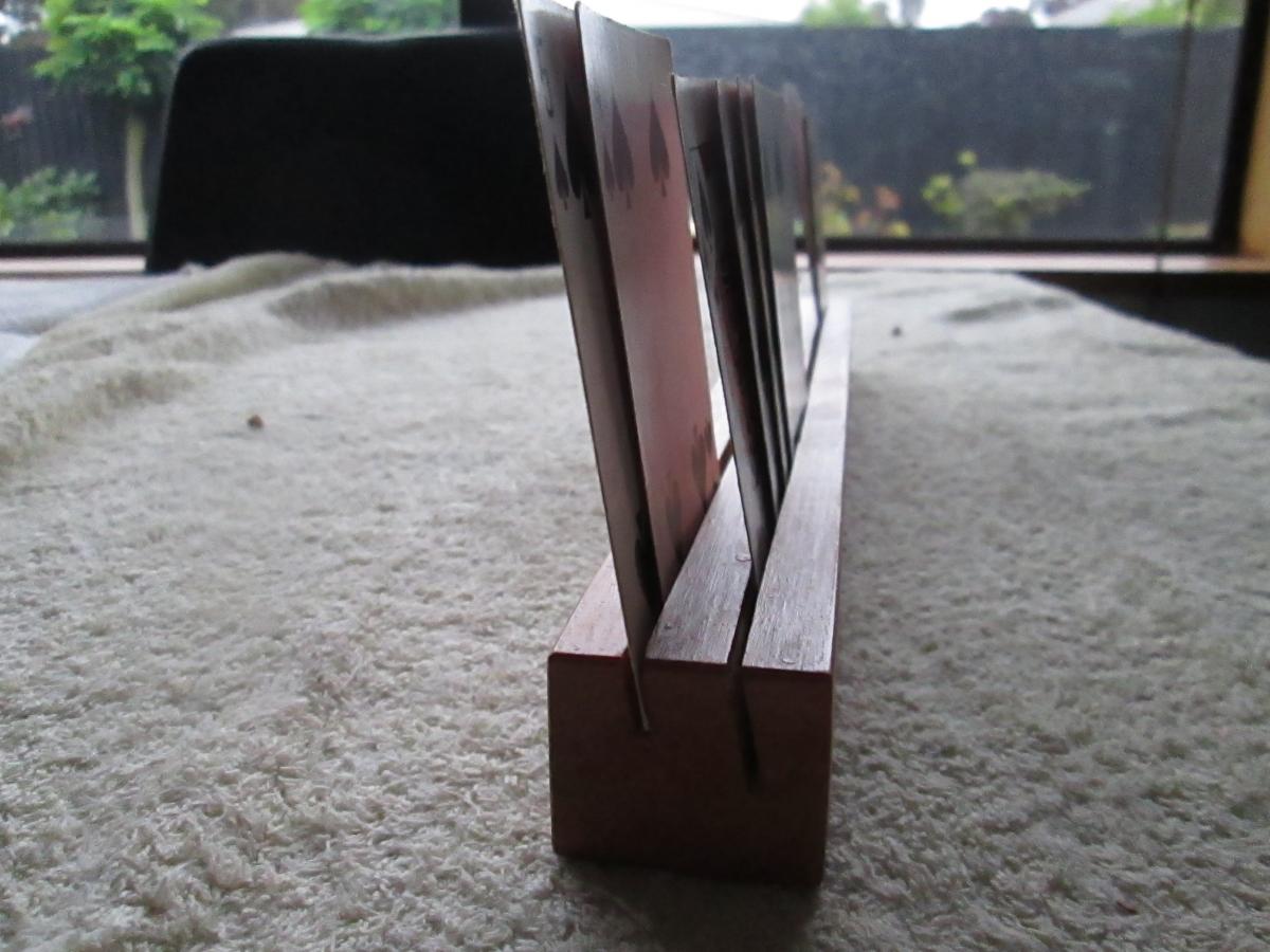 2 in plywood pine, They are varnished. 330mm long, used for when you need to hold cards, or you have pick ups in your card game, ( like Bolivia) They have 2 slots $12.50 or 3 slots $15.00 . The slots are cut at different Hights.