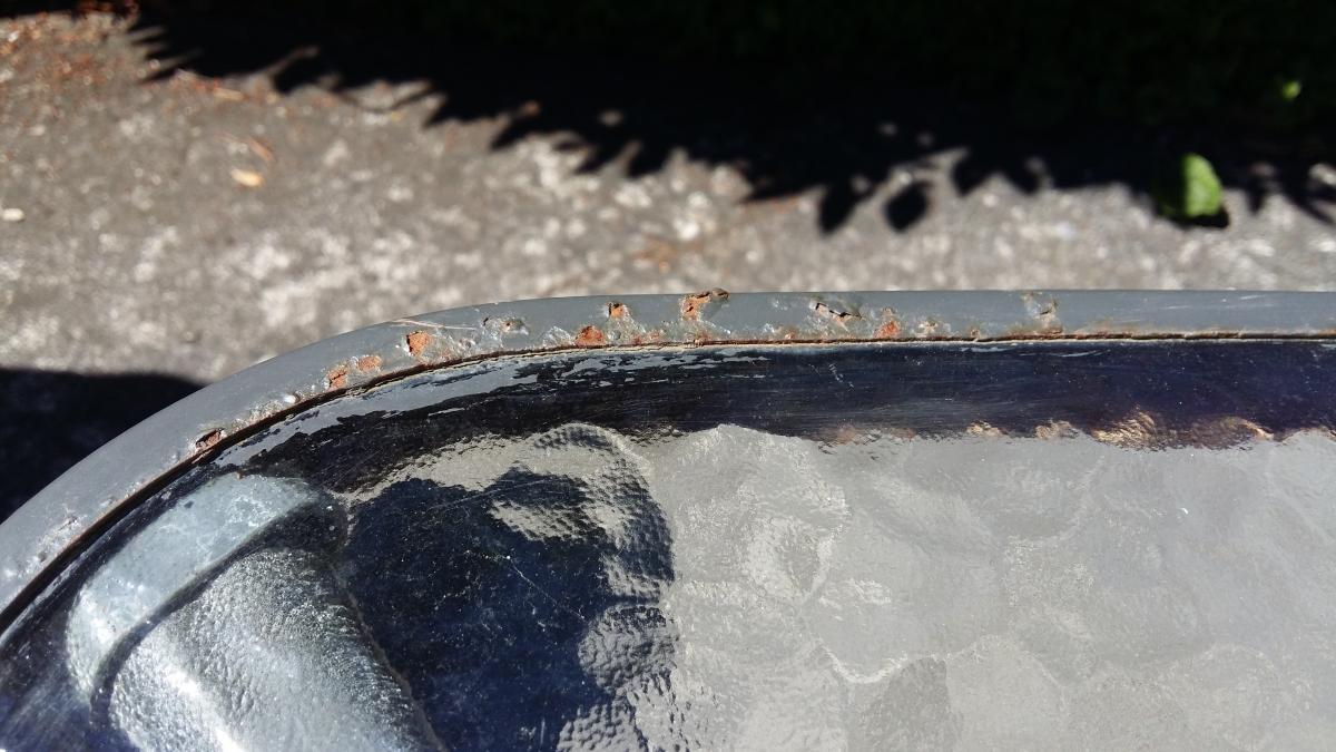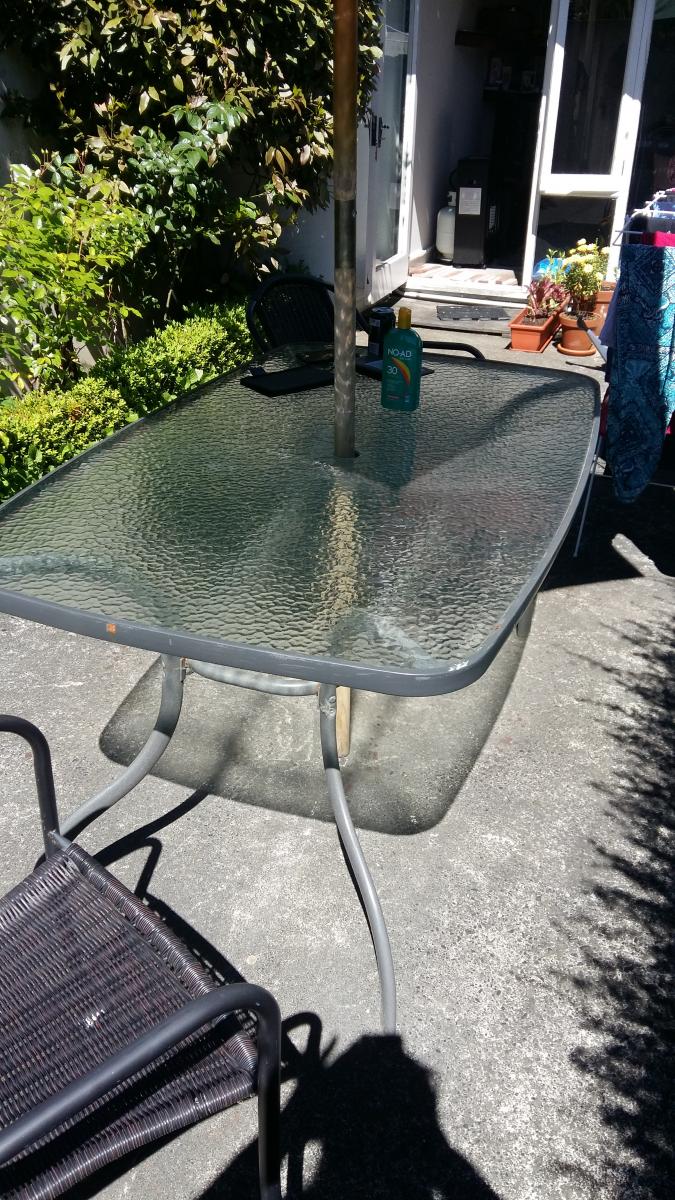 Great table and chairs. Good condition, small amount of rust (as shown). Two chairs in good condition. selling as too big for our space. table top is 90cm x 150cm at the widest point.