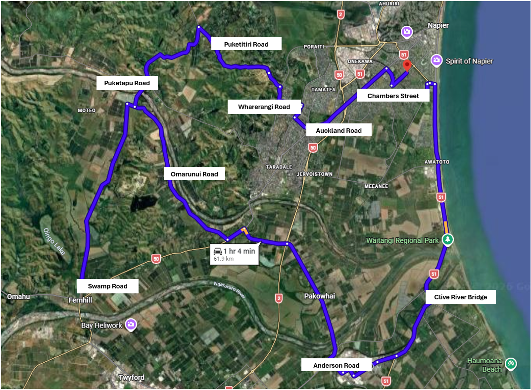 Police are appealing for sightings of a white 2005 Mazda 3 sports hatchback between 8am and approximately midday on Sunday 1 February 2026, travelling from the Awatoto area, through Taihape Road/Omahu Road and the Fernhill area, and into Marewa, Napier. [see pictured map]
