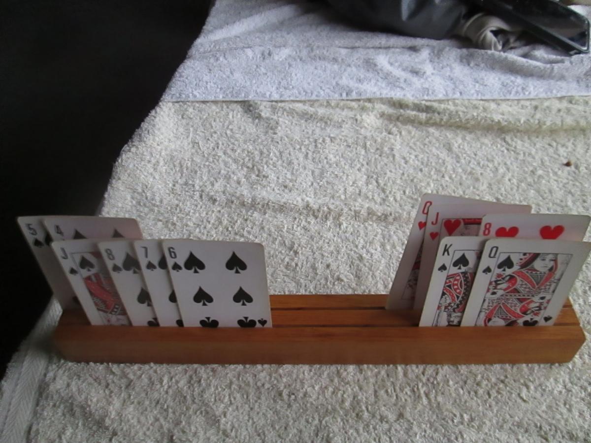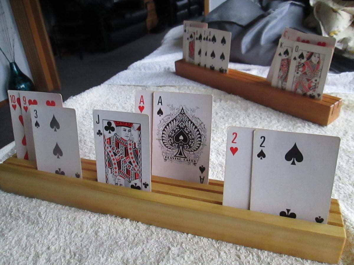 2 in plywood pine, They are varnished. 330mm long, used for when you need to hold cards, or you have pick ups in your card game, ( like Bolivia) They have 2 slots $12.50 or 3 slots $15.00 . The slots are cut at different Hights.