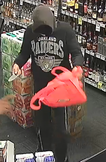 Around 9pm a man entered the store, presented a knife and demanded cash and cigarettes. He was wearing a black hoodie with “Oakland Raiders” on the front and black pants, and left with a large quantity of cash and cigarettes.