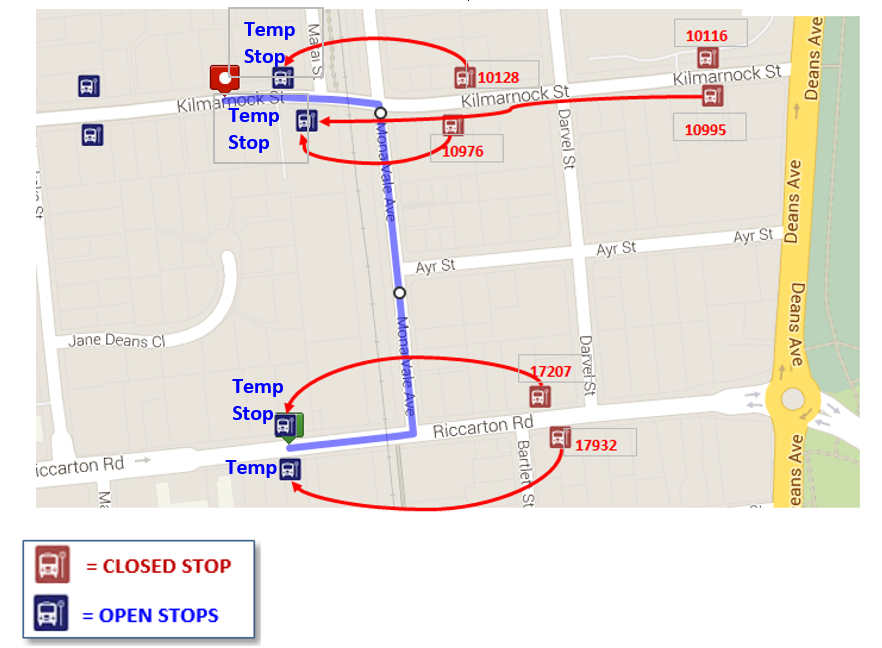 On Monday 24th October and Tuesday 25th October all buses will detour away from Riccarton Rd and Kilmarnock St between 7pm and 5.30am each night while road works are carried out at the intersection of Riccarton Rd and Deans Ave. Buses travelling towards Avonhead will detour off Riccarton Rd onto … View moreOn Monday 24th October and Tuesday 25th October all buses will detour away from Riccarton Rd and Kilmarnock St between 7pm and 5.30am each night while road works are carried out at the intersection of Riccarton Rd and Deans Ave. Buses travelling towards Avonhead will detour off Riccarton Rd onto Mona Vale Ave then back onto Kilmarnock St to continue the normal route. Buses travelling towards Westfield and Hei Hei will detour off Kilmarnock St onto Mona Vale Ave back onto Riccarton Rd to continue the normal route. Bus stops 17207 and 17932 on Riccarton Rd will be closed during this time and passengers can use temporary stops available on Riccarton Rd between Mona Vale Ave and Harakeke St instead. Bus stops 10128, 10116, 10976 and 10995 on Kilmarnock St will also be closed during this time and temporary stops will be available further west on Kilmarnock St close to Matai St corner. View detour map attached.