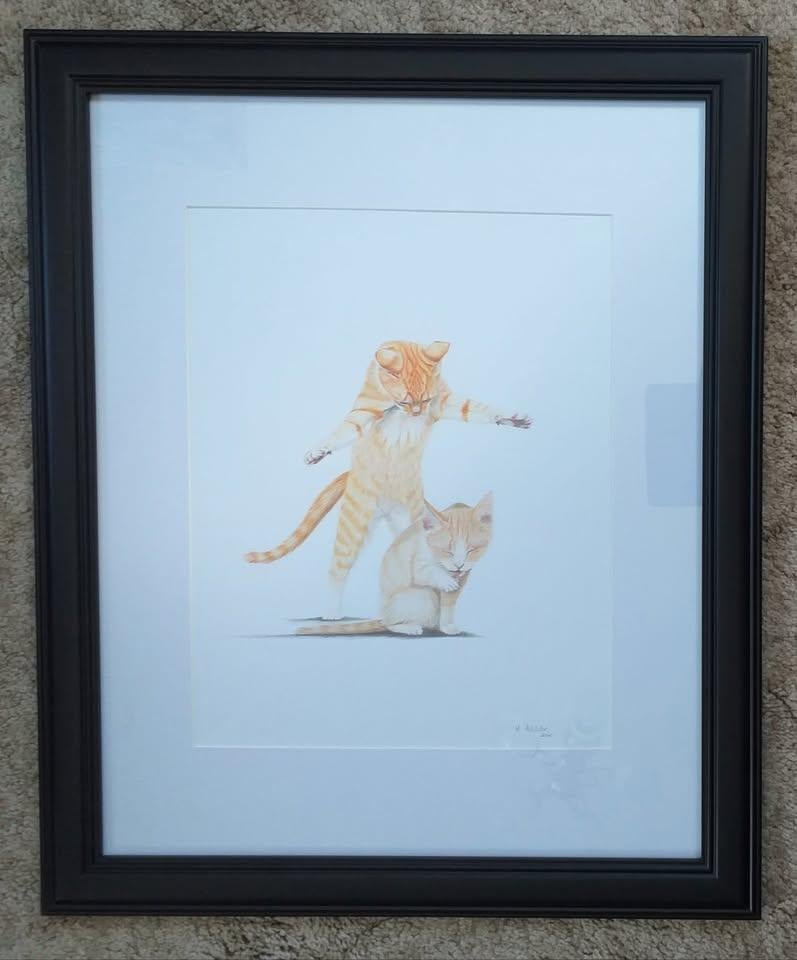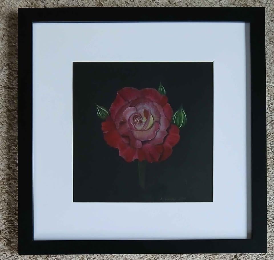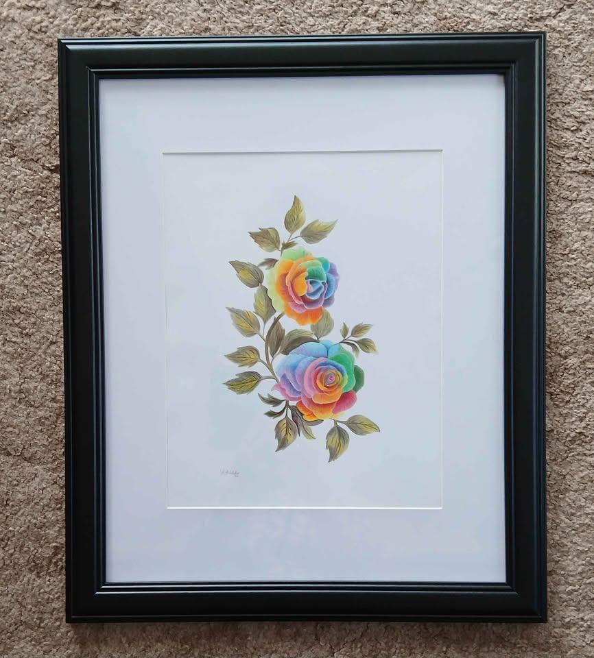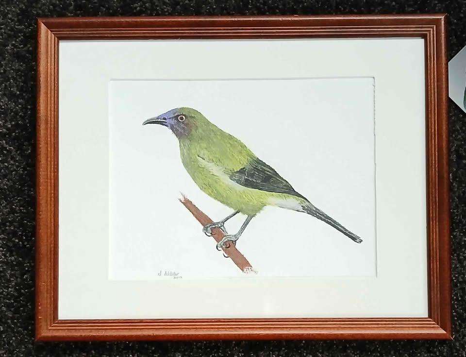 Drawn in water colour pencils by myself. Framed in a reused frame. Frame measures 14 x 11 inches.