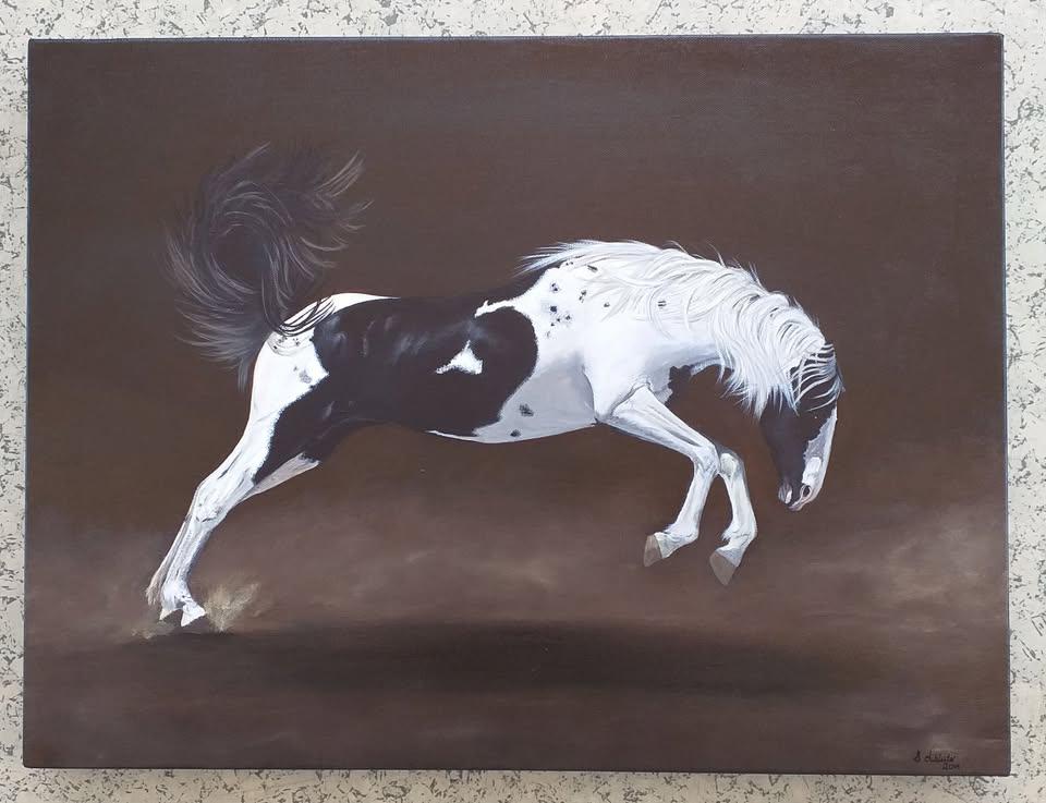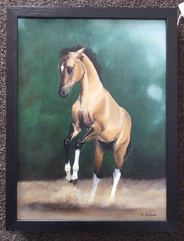 A happy little chap rearing in play in his paddock. Frame measures 17inches by 13 inches. Frame is black on the front but has a nice light brown colour down the sides. Really picks up on the foals colouring when viewed from an angle.