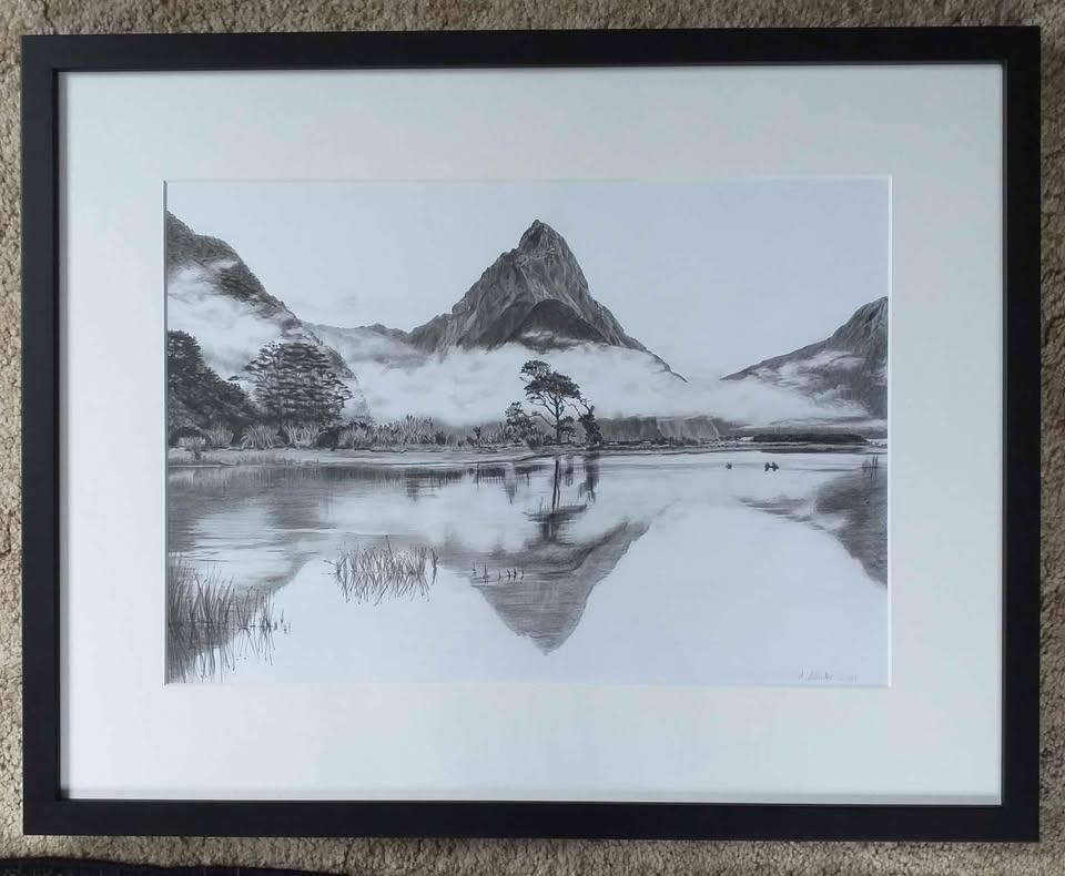 An original drawing of Milford sound. Drawn in graphite pencils and professionally framed.