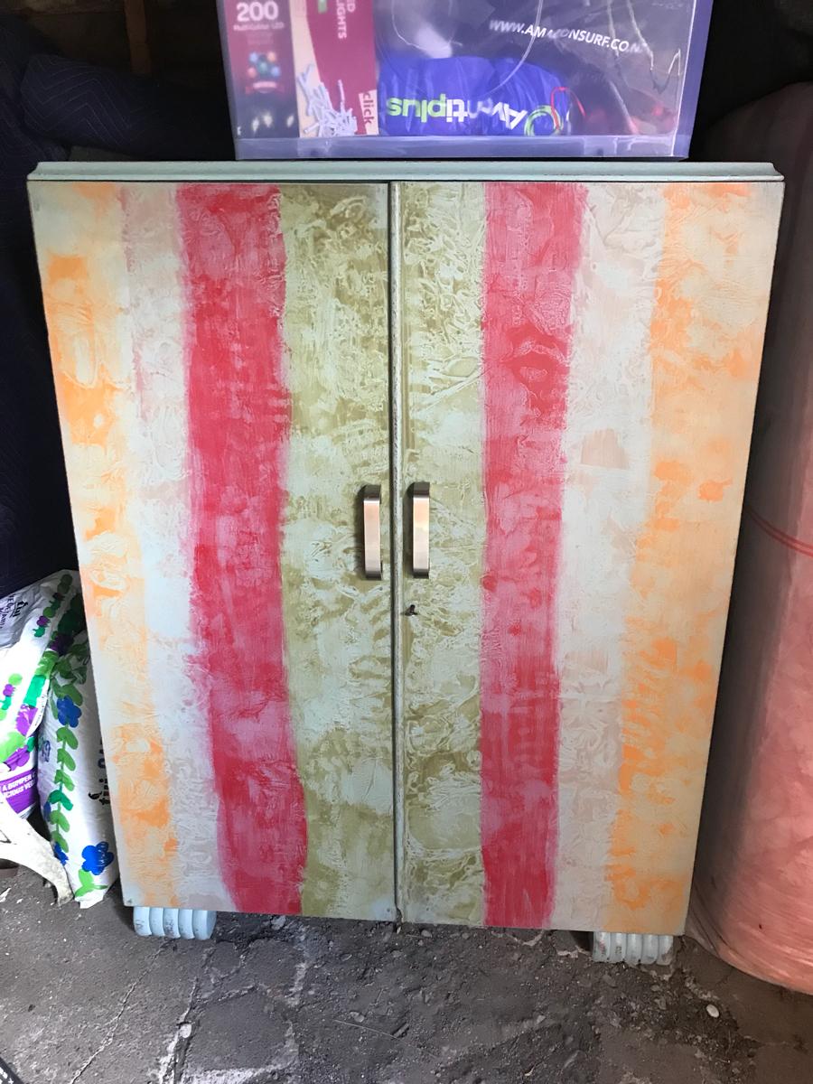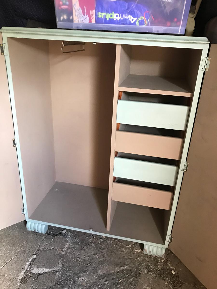 Sides and top painted using Anne Sloan Chalk Paint Duck Egg Blue. The inside it was used Anne Sloan Chalk Paint Coco and Duck Egg. Lightly distressed. Had some borer but was treated. Read less