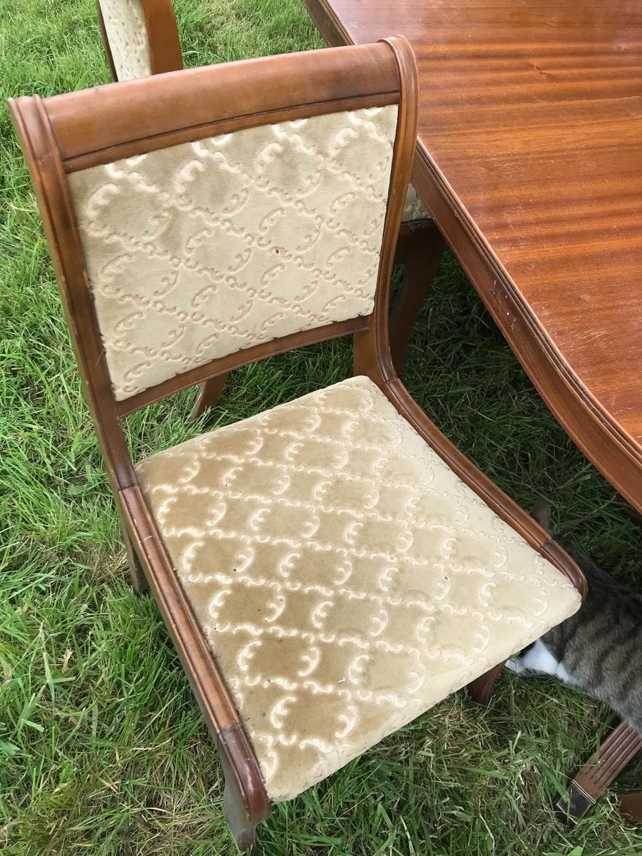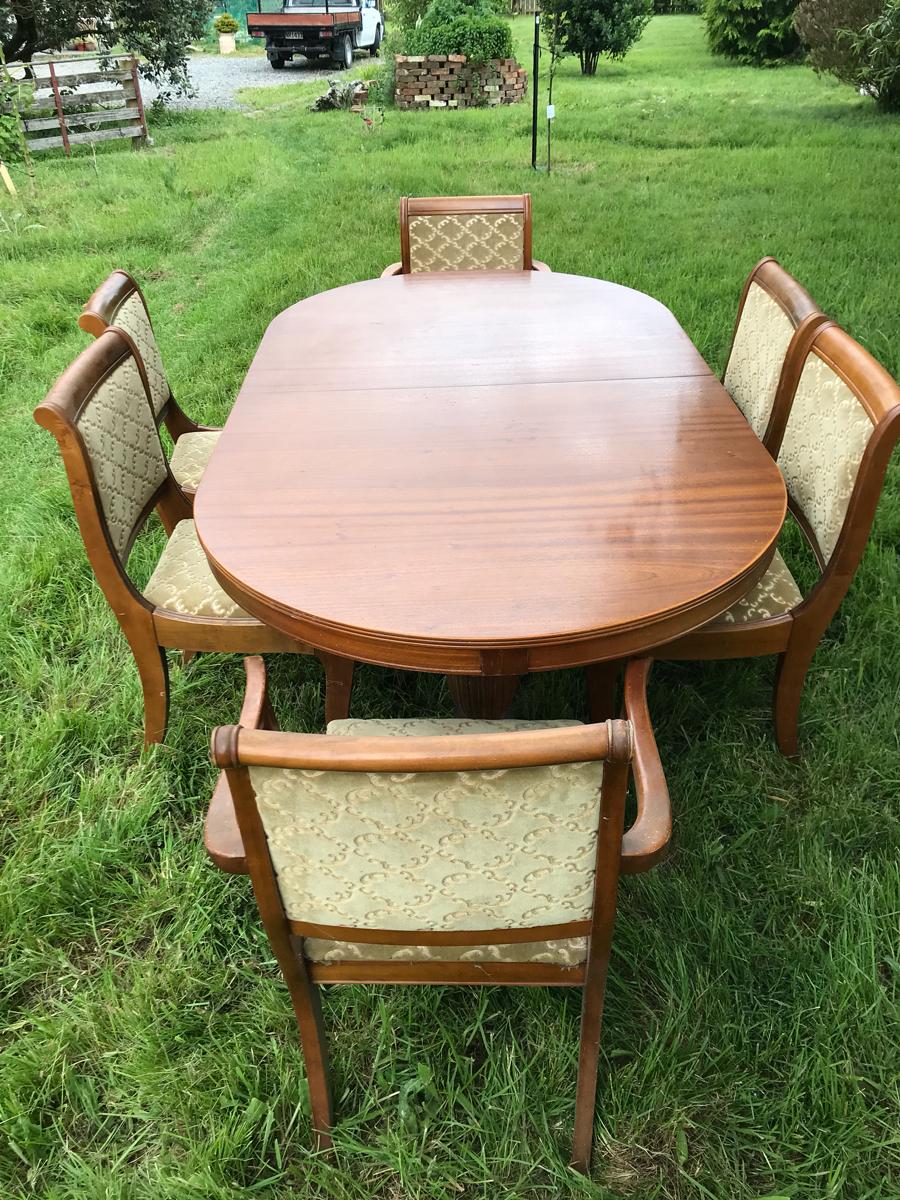 Solid wood extending dining table and 6 fabric upholstered seat chairs. there are some scratches as can be seen in pics, but overall good condition, not used for a while now. There are 4 chairs and 2 carvers with arms. Can seat from 8 to 10 people when extended.