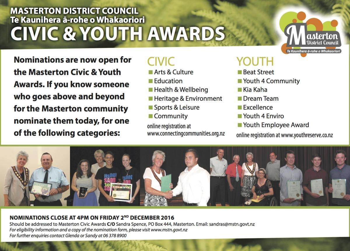 Masterton District Council Civic and Youth Awards are open for nominations. Nominations close 4.00pm Friday 2 December and should be addressed to Sandra Spence PO Box 444 Masterton. This year we have made it easy, you can nominate online or call into the council offices in the old ANZ building on … View moreMasterton District Council Civic and Youth Awards are open for nominations. Nominations close 4.00pm Friday 2 December and should be addressed to Sandra Spence PO Box 444 Masterton. This year we have made it easy, you can nominate online or call into the council offices in the old ANZ building on Queen Street or visit the Masterton Library for the guidelines and nomination form.