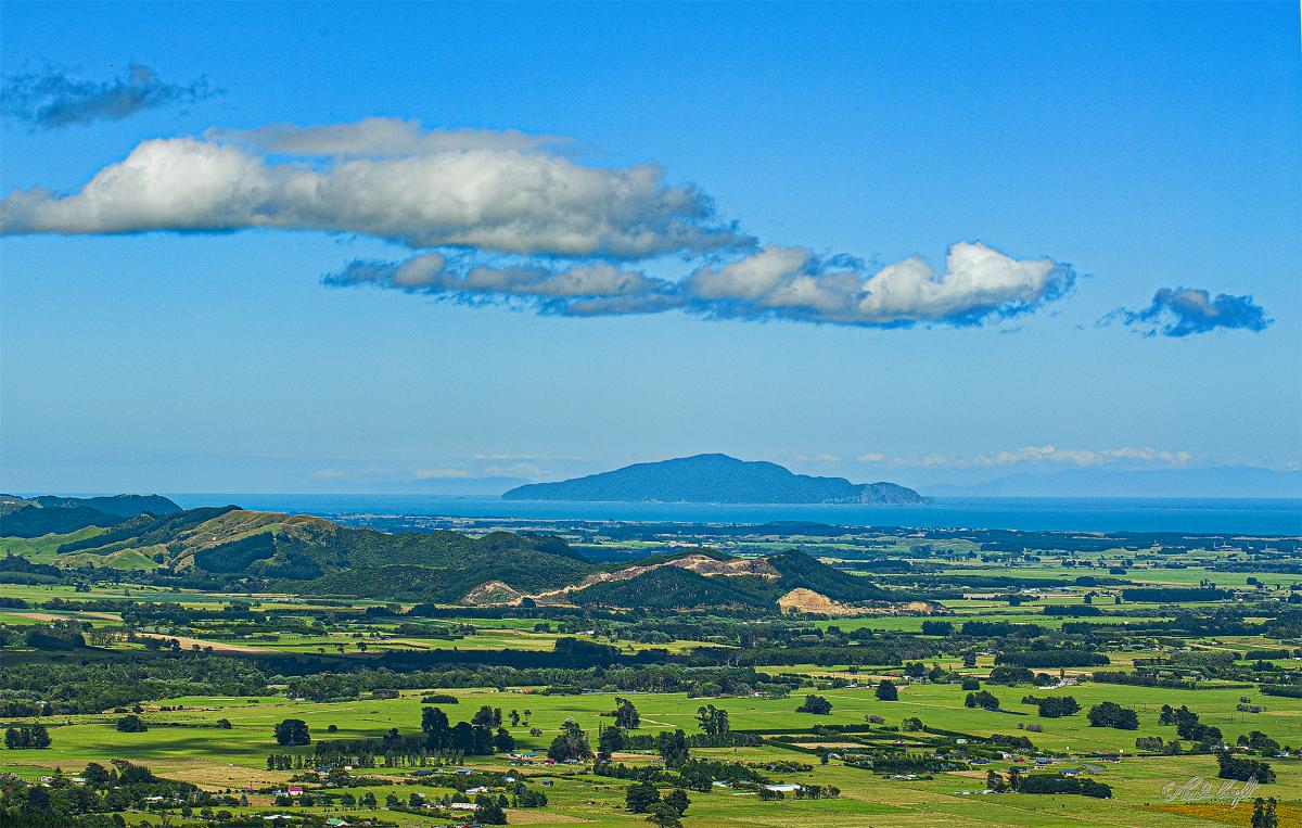 A view of Kapiti Island from the Arapaepae Ridge, photographed in 2007. A hazy view of the South Island also visible on the horizon.