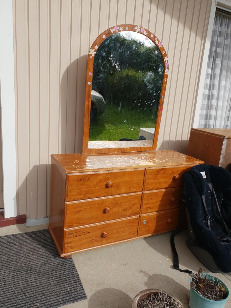 1 set large 6 drawer with mirror. There is water damage to the top and has writing and stickers on it, could be good as a fixer upper.