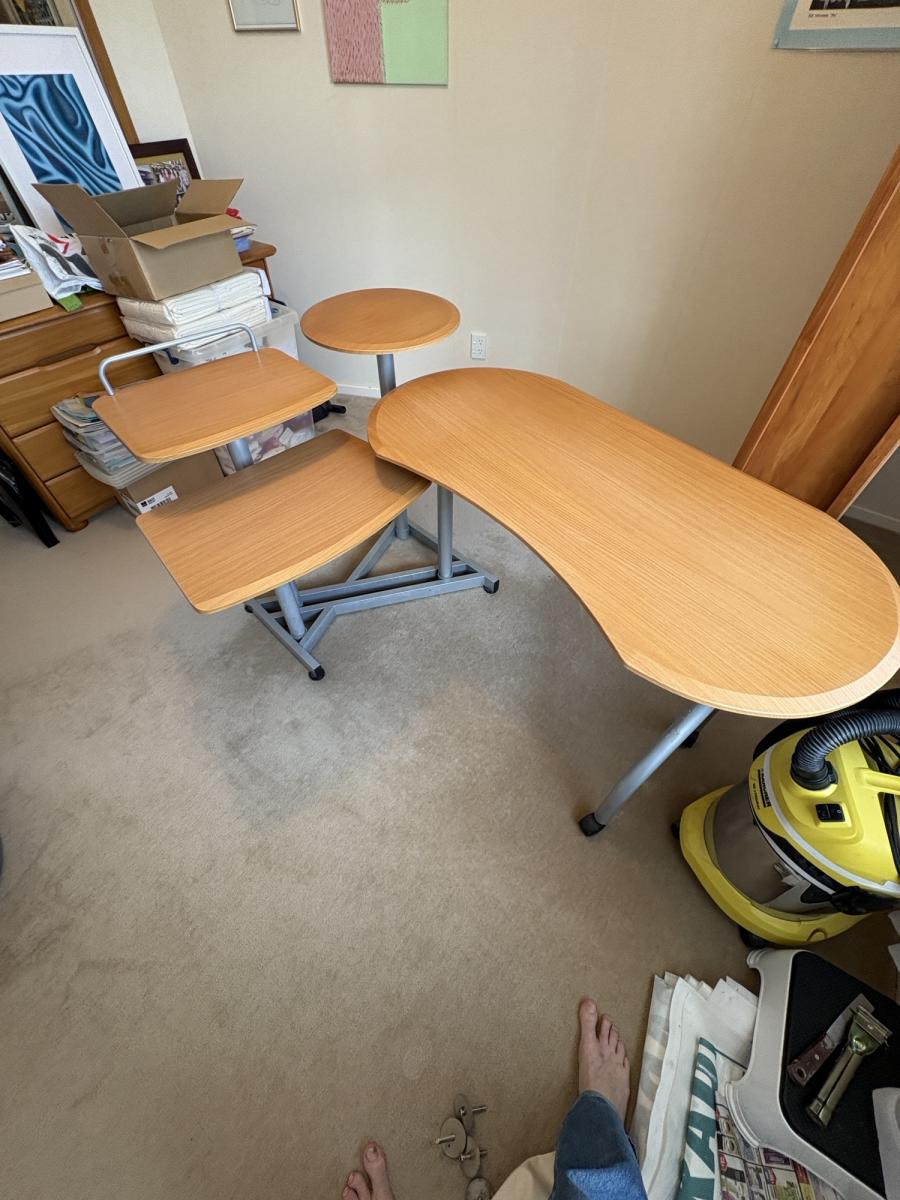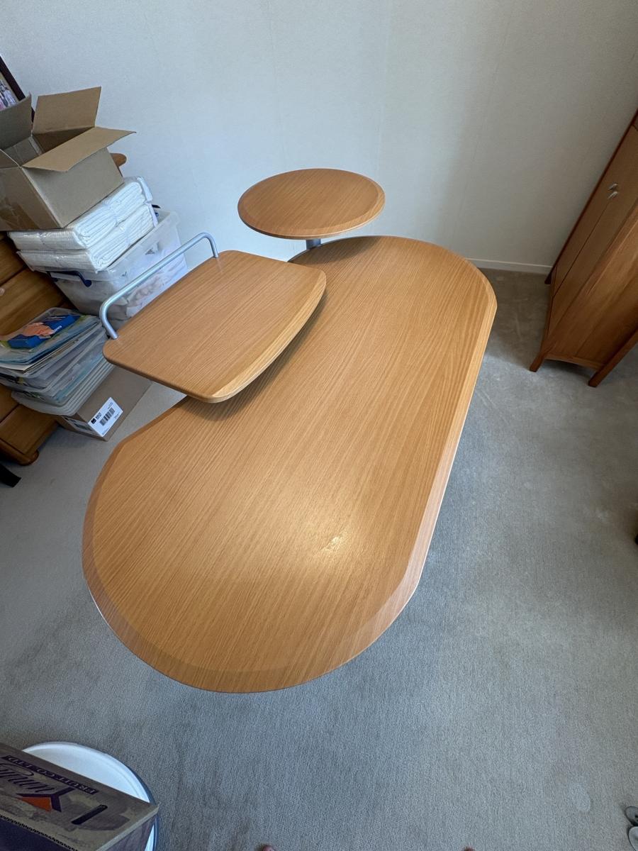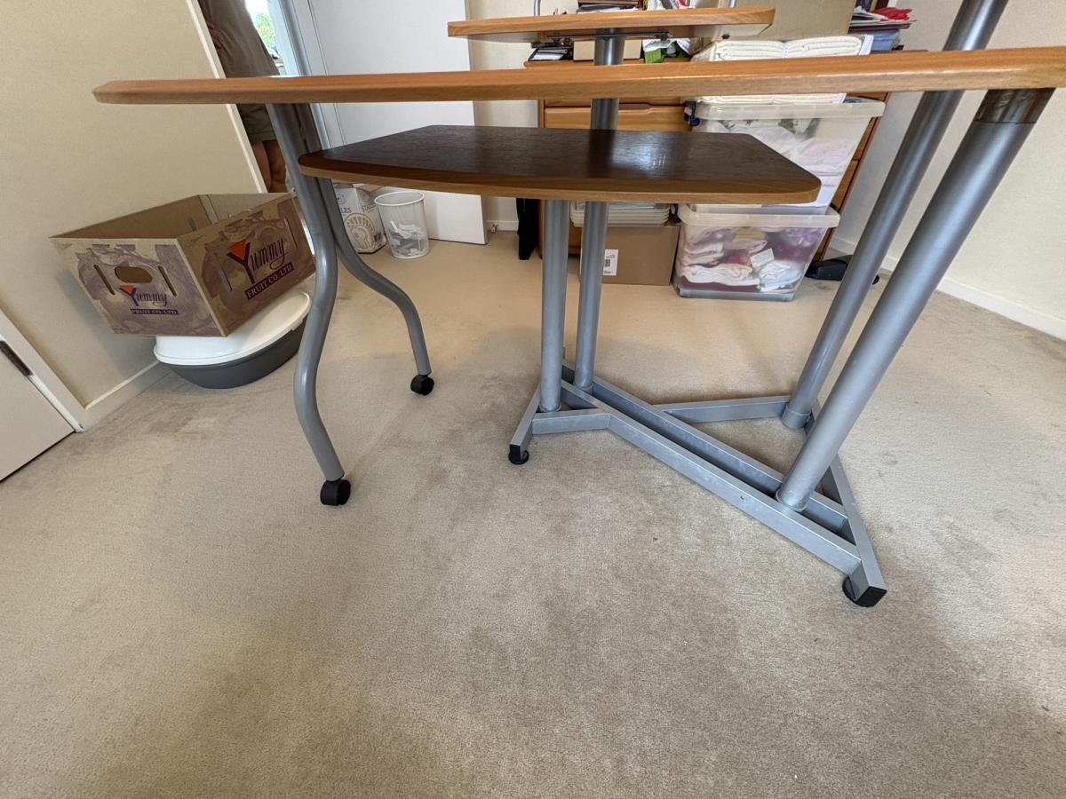Largest piece has wheels one end so can be opened out past 90 degrees so have two work areas.
