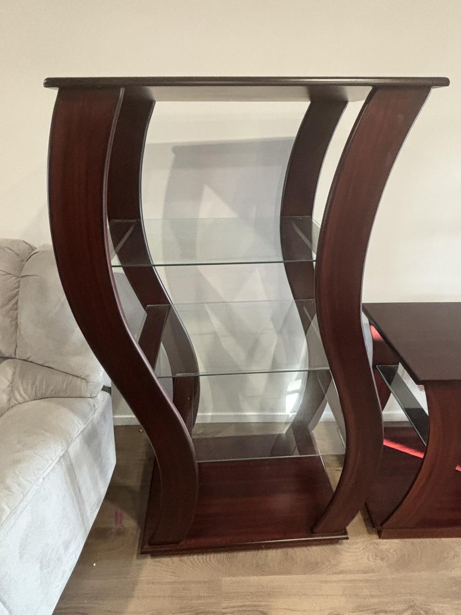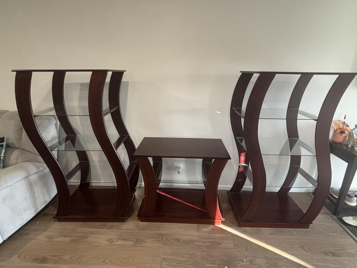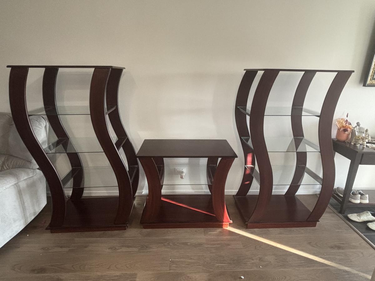 Quality TV stand featuring three cabinets and glass display shelves, perfect for showcasing décor, books, or collectibles. Functional storage combined with an elegant display design.