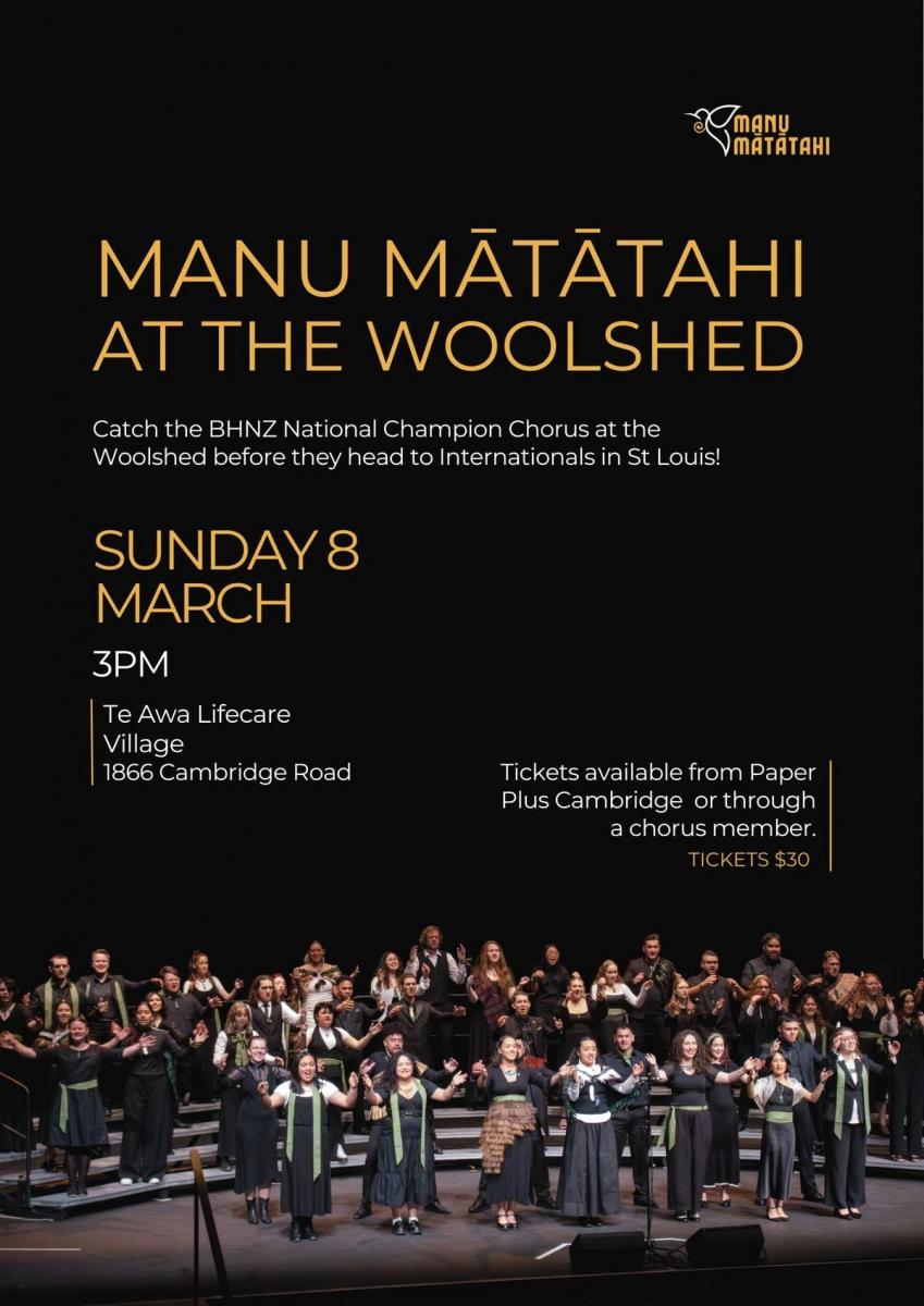 The "youthful songbirds" of Manu Mātātahi, New Zealand's top barbershop chorus, are entertaining at The Woolshed (Te Awa Lifecare Village) next Sunday at 3pm.