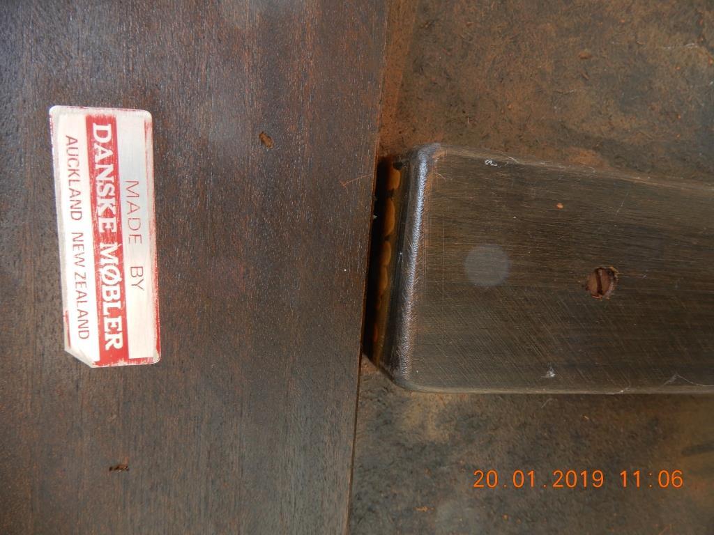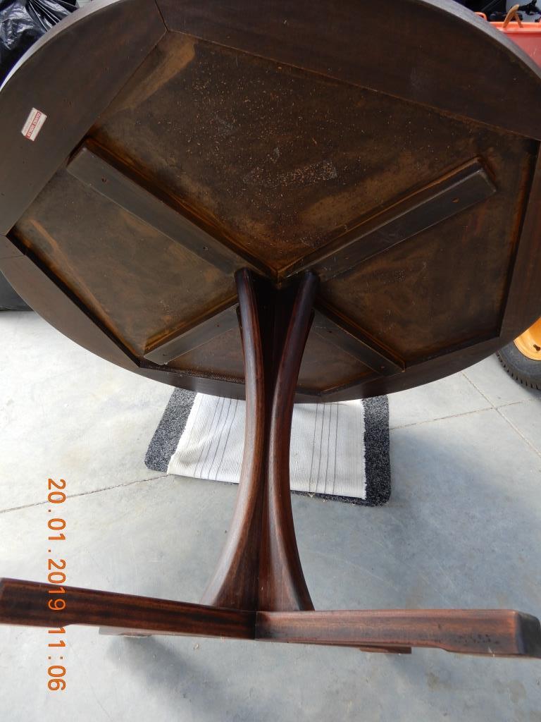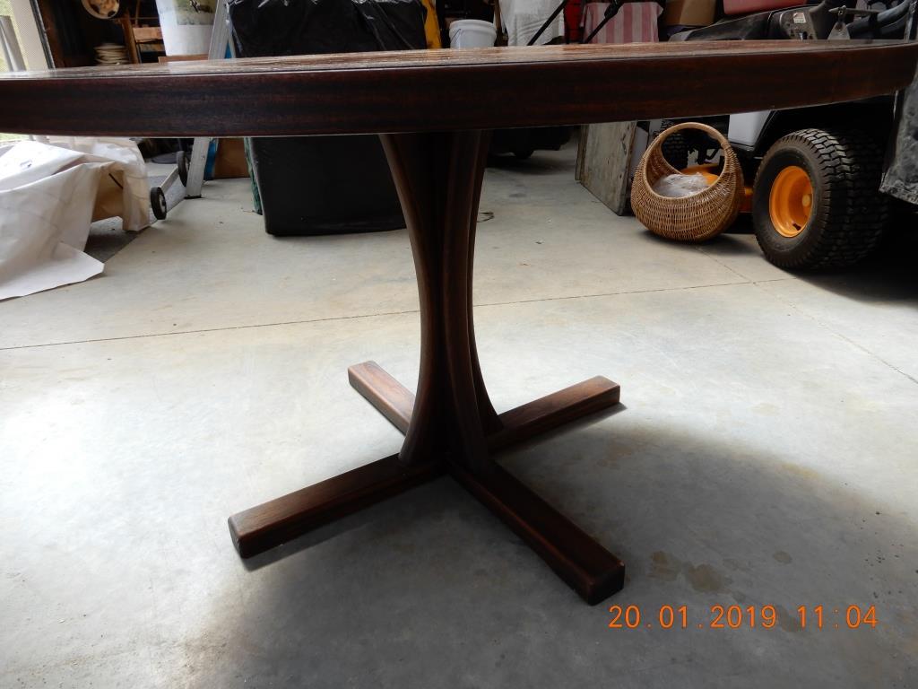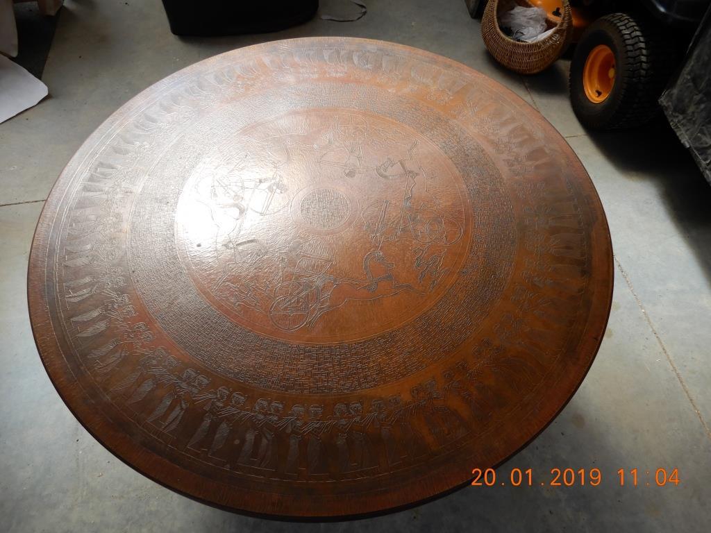 Solid Mahogany copper top round table. Made by Danske Mobler. Measures 1200mm across and depth 730mm. Good condition. Unique design. Remember copper is expensive. The copper top is engraved. Seats 6 - no chairs.