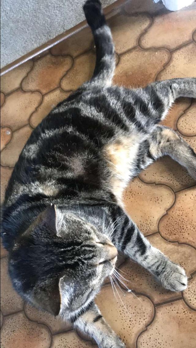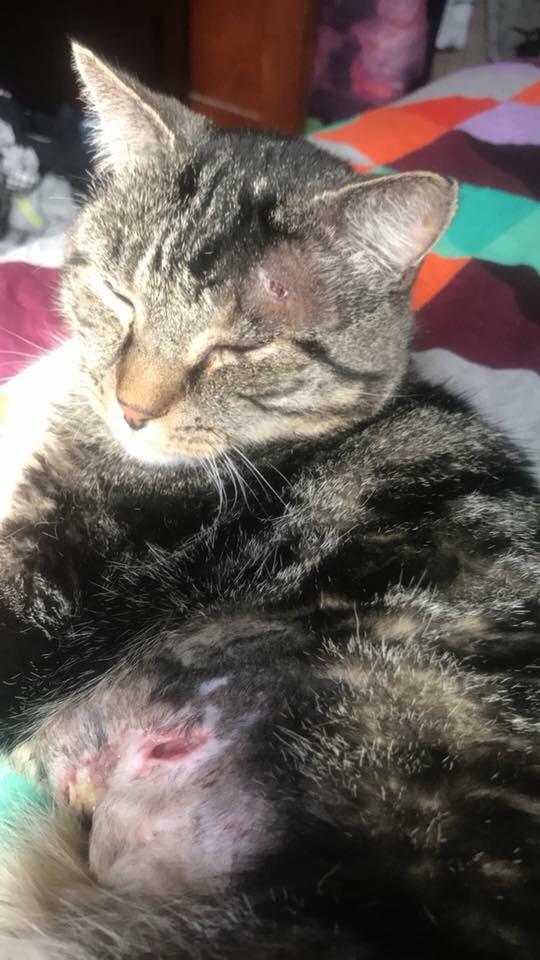 It’s got some very bad wounds that the vet didn’t /couldn’t stitch. I’d describe it as tortoiseshell but others might not.