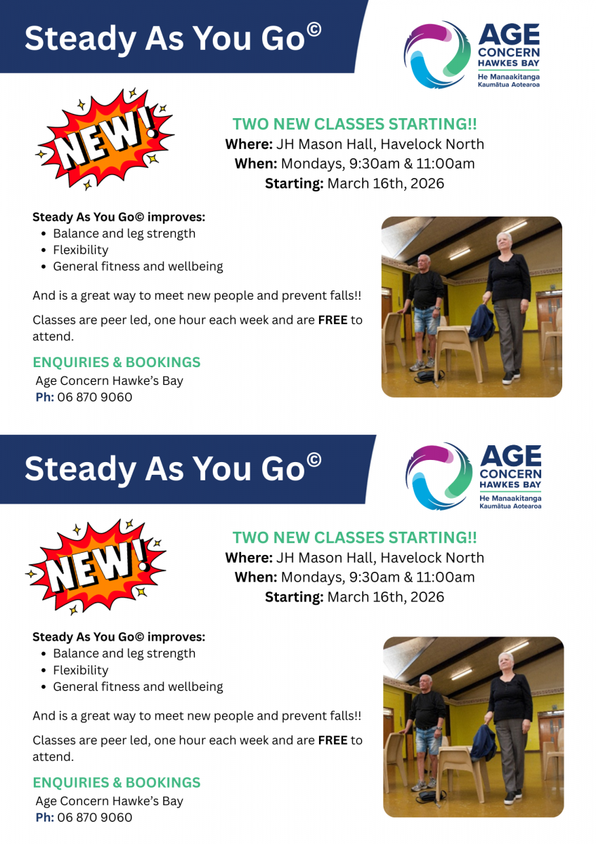 Interested in joining a strength and balance falls prevention exercise class? Steady As You Go is great strength and balance falls prevention exercise class. Two new classes will be starting on March 16th at the JH Mason Hall (18 Durham Drive, Havelock North). Class will be every Monday and two times are available. Either join the 9:30am class or the 11:00am. Each class is about an hour long and FREE to attend. Registration is essential as numbers are limited. It's also a great opportunity to meet others.