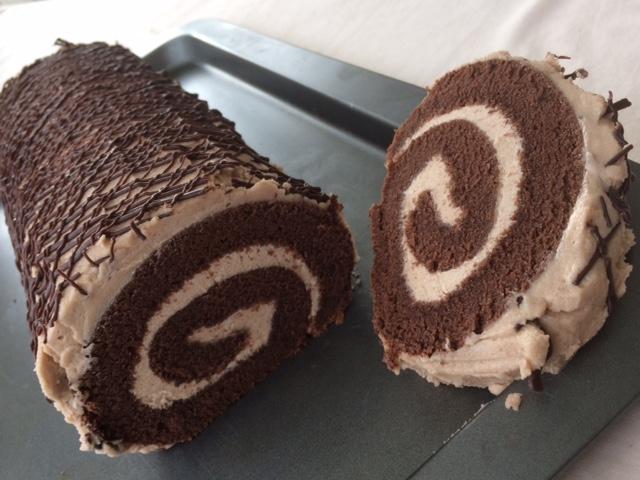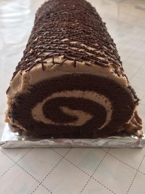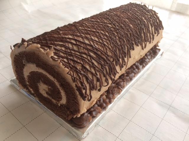This appealing chocolate Swiss roll is filled with traditional chocolate cream, covered in soft chocolate butter cream and is decorated with dark chocolate.
