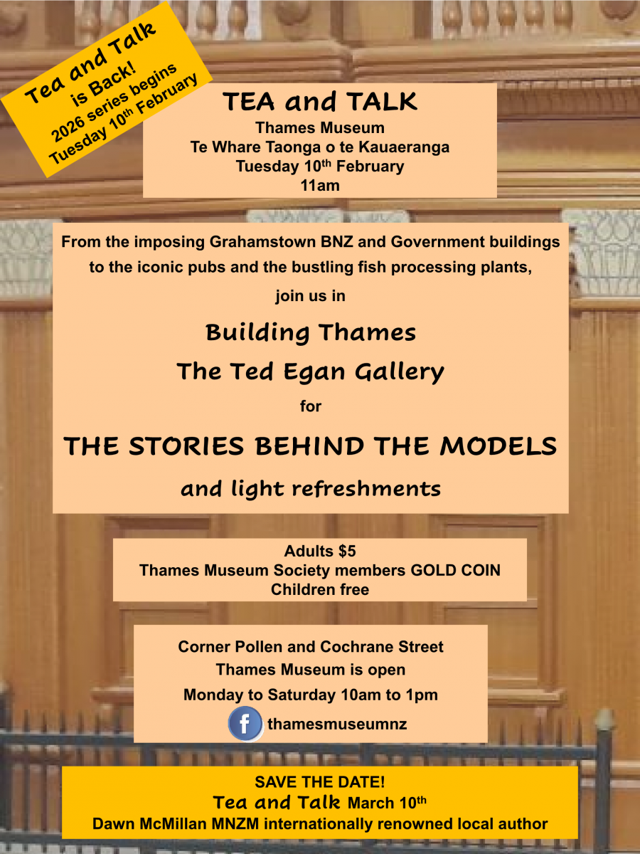 Join us at Thames Museum Te Whare Taonga o te Kauaeranga on Tuesday 10th February at 11 o'clock for a fascinating look at the stories behind the buildings in our unique Ted Egan Building Thames Gallery. All welcome.