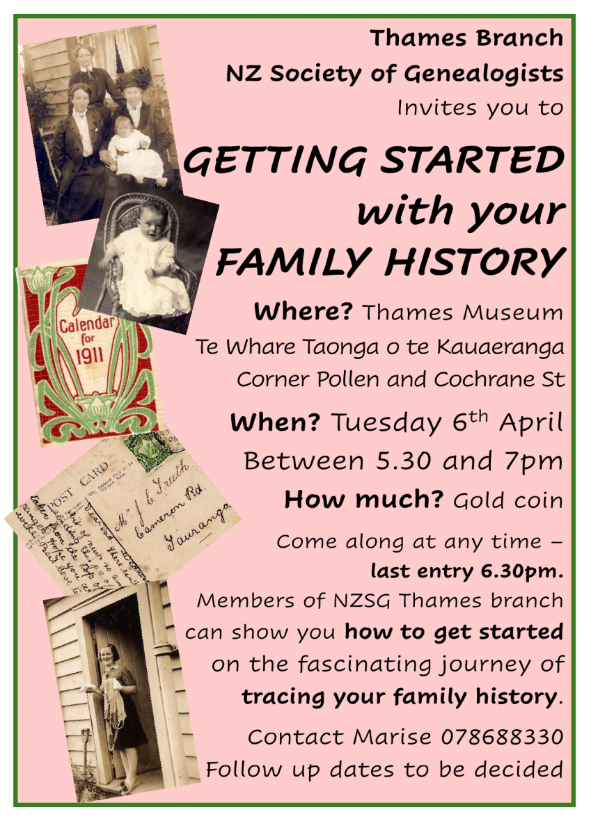 If you’d like to know more about how to research your family tree and its history, GETTING STARTED with YOUR FAMILY TREE with NZ Society of Genealogists Thames Branch and Thames Museum te Whare Taonga o te Kauaeranga is for you. We’re looking forward to getting you started.