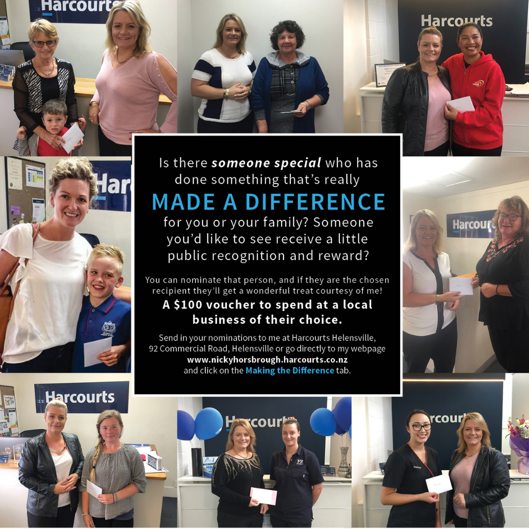 Send in your nominations to me - simply go to my web page nickyhorsbrough.harcourts.co.nz... and click on the 'Making the Difference' tab to fill out the form or write to me at 92 Commercial Road, Helensville