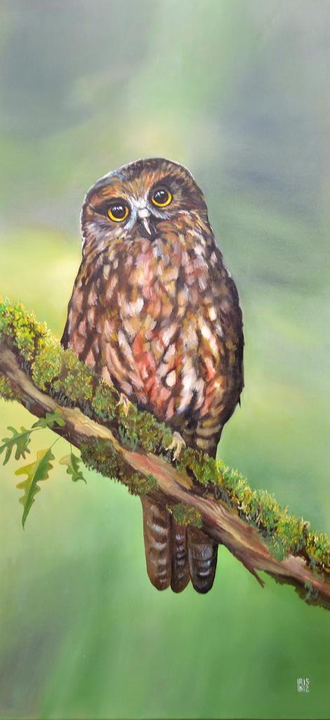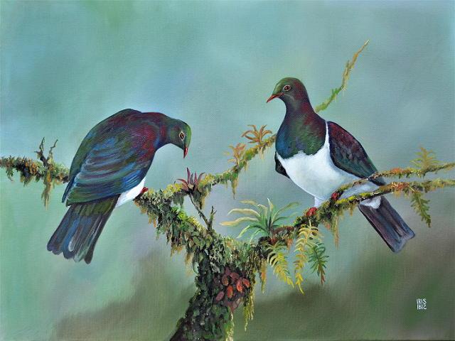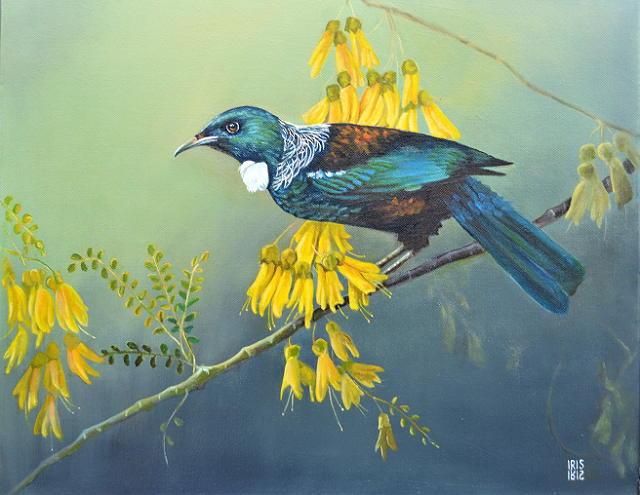 In celebration of our wondrous native bird life, Artspace Gallery is hosting one of Wellington regions most talented bird artists, Iris Reesby. Iris has a magical passion for painting birds and we are very excited to see a collection of approx 40 of her paintings hung together. Iris paints exclusively in oils and her skilful and realistic portrayals of New Zealand birds and bush will hold you spellbound. Each painting tells a story, with well thought out quirky titles that will make you smile. In some, it almost feels as if you are walking through the bush. Iris is also skilled at painting florals (the iris of course being quite a favourite) and painting pets/animals, which she is often commissioned to paint.