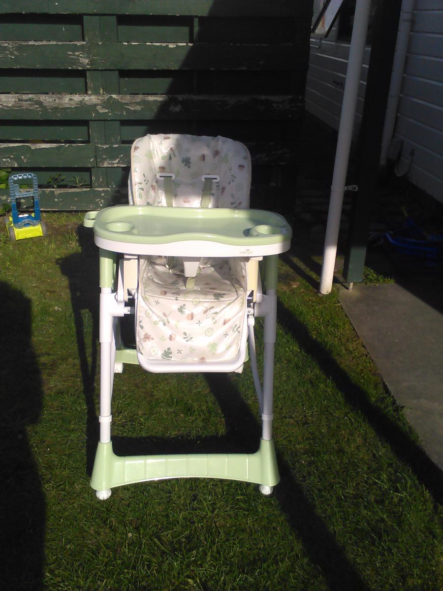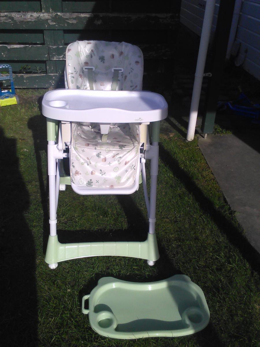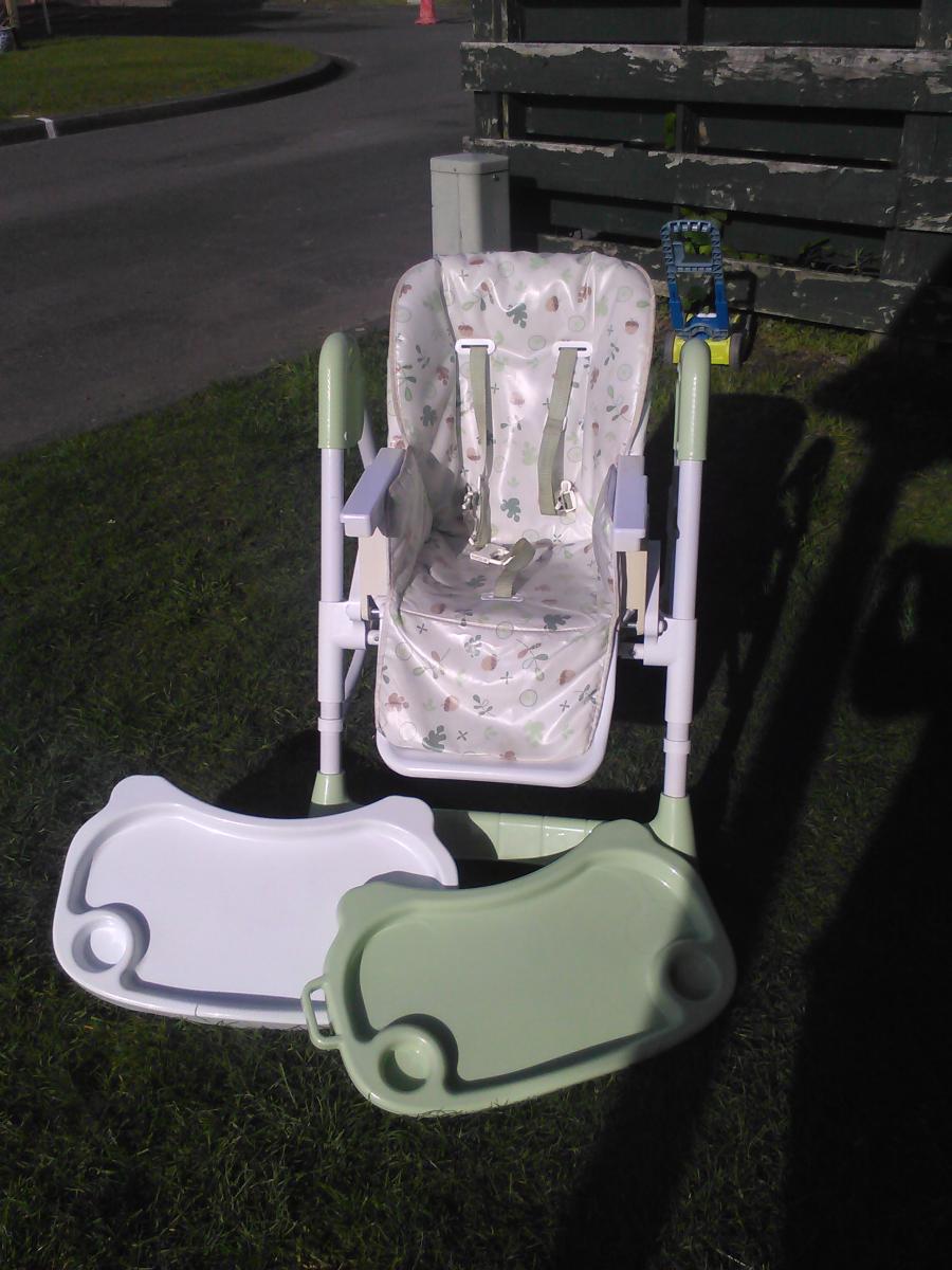 I have a highchair that is no longer needed. Adjustable height and two removable trays. The top tray has two cup holder holes and clips onto the tray underneath which has one cup holder. Very sturdy and still in great condition.