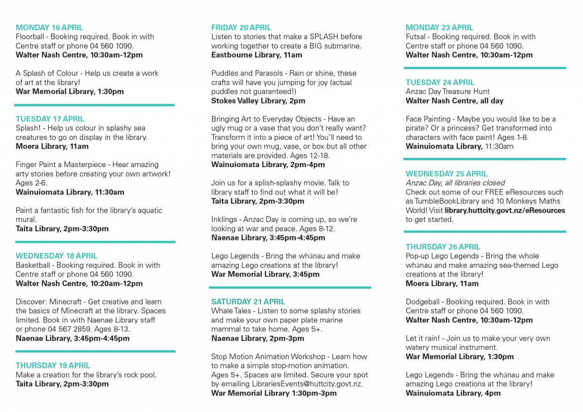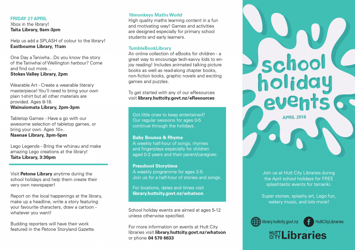 Join us at Hutt City Libraries during the April school holidays for FREE splashtastic events for tamariki.