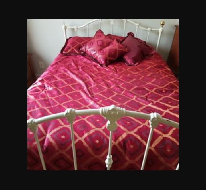 good original condition. Has modern queen size base and pillow top mattress in good condition and very comfortable (personal reference) base and mattress sit on the steel rails very well but you could add slats for stability. Some paint missing on tail board - see photos. Can repaint or leave as it… View moregood original condition. Has modern queen size base and pillow top mattress in good condition and very comfortable (personal reference) base and mattress sit on the steel rails very well but you could add slats for stability. Some paint missing on tail board - see photos. Can repaint or leave as it adds character. One brass ball needs minor repair but will be included. Note: bed linen not included. Listed elsewhere