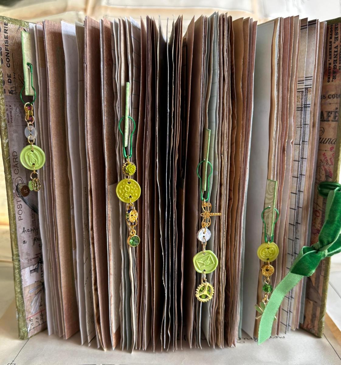 Each signature is highlighted with a charm that I have created and all of my journals have a detachable chain of charms that hang from the spine.
