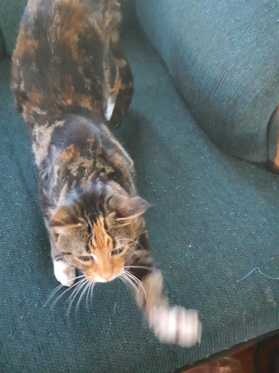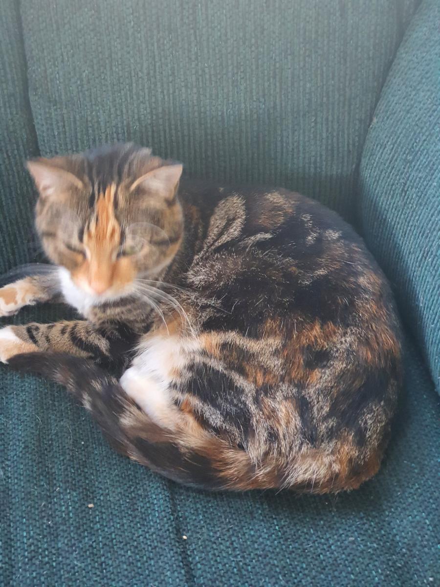 Nene is a Tortoiseshell cat and is anxious but loves hugs and attention. Same with Sai but he is a mixed tabby cat with a bit of white.