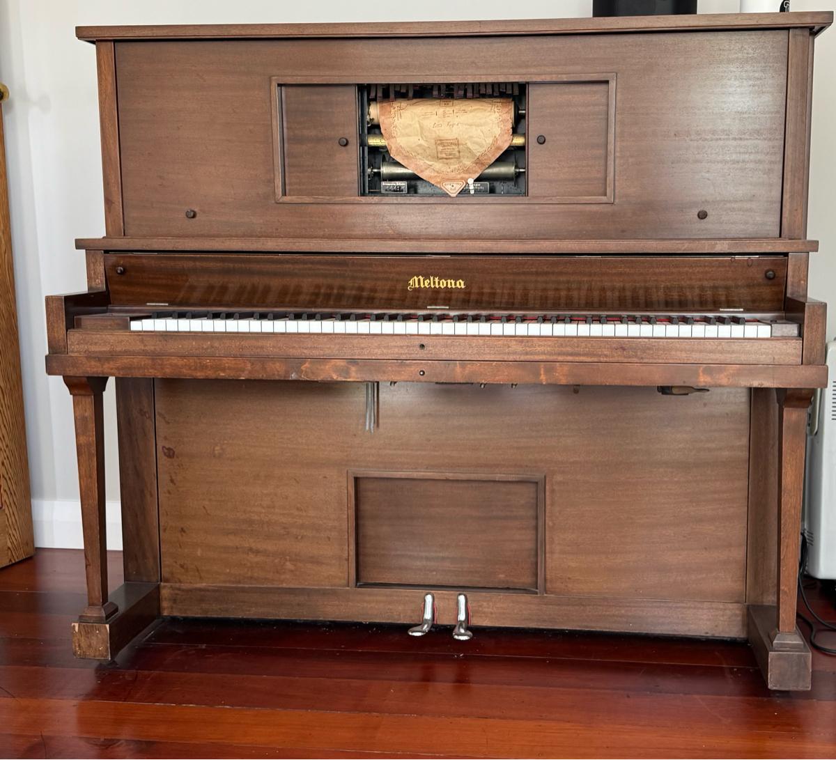 All works but may need tuning. It is free but you need to organise the move from roughly 50 steps down external stairs. The piano comes with a number of rolls which I understand is for playback but we have never used it. The make is Meltona brand London / Canada.