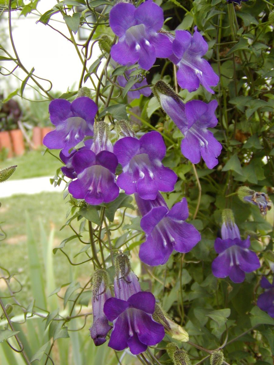 This is a dainty little climber with thumb sized blue flowers that flower all Summer. I have one here in a pot which is coming along nicely.