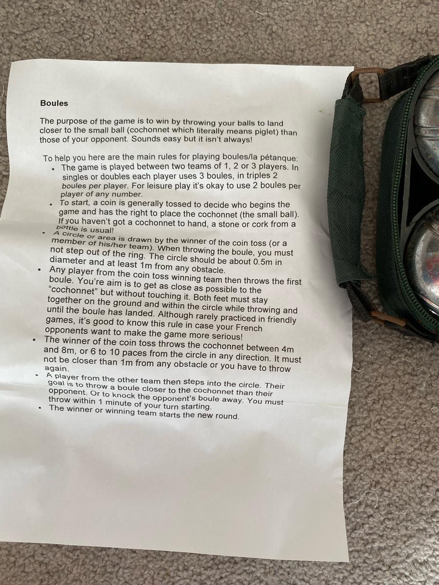 Great game to play over the holidays. A full set of Boules with rules to guide you.