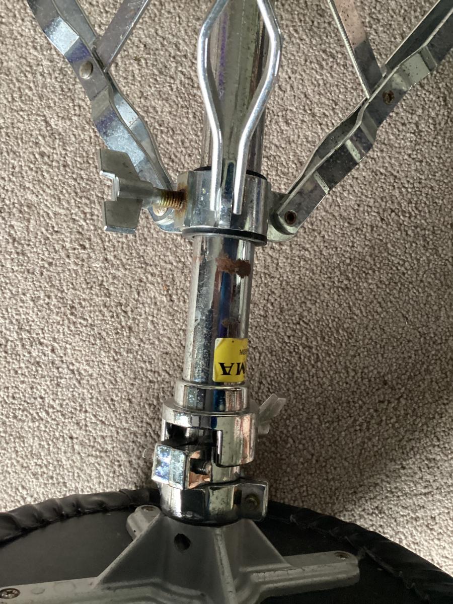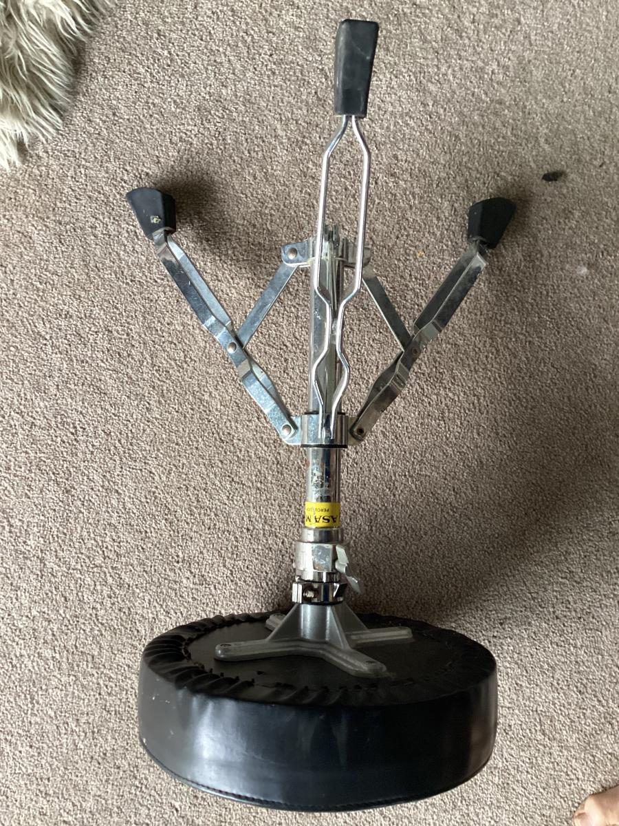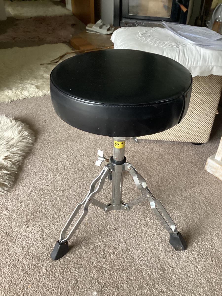 Black drum stool with vinyl top , three legged, adjustable height, swivel top. I used it to play the harp , so it could have several uses.