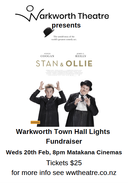Tickets are $25 each and … View moreTo assist with raising funds towards a much-needed upgrade of the lighting rig Warkworth Theatre and other users can utilise at the Warkworth Town Hall we are thrilled to announce a pre-release screening of the superb new movie Stan and Ollie at Matakana Cinemas.