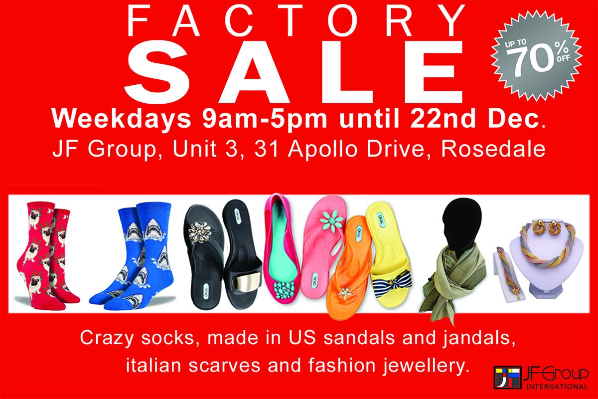 Hi neighbours. Join us at our HUGE Factory Sale for up to 70% off crazy socks, made in US sandals and jandals, Italian scarves and fashion jewellery. Get your Christmas gifts sorted!