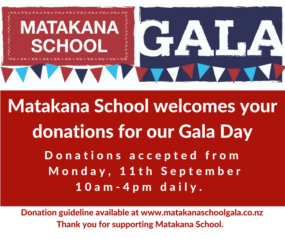 Matakana School welcomes your donations for their annual school Gala which is being held on Saturday, 21st October 2017 from 10am-2pm. Thank you.