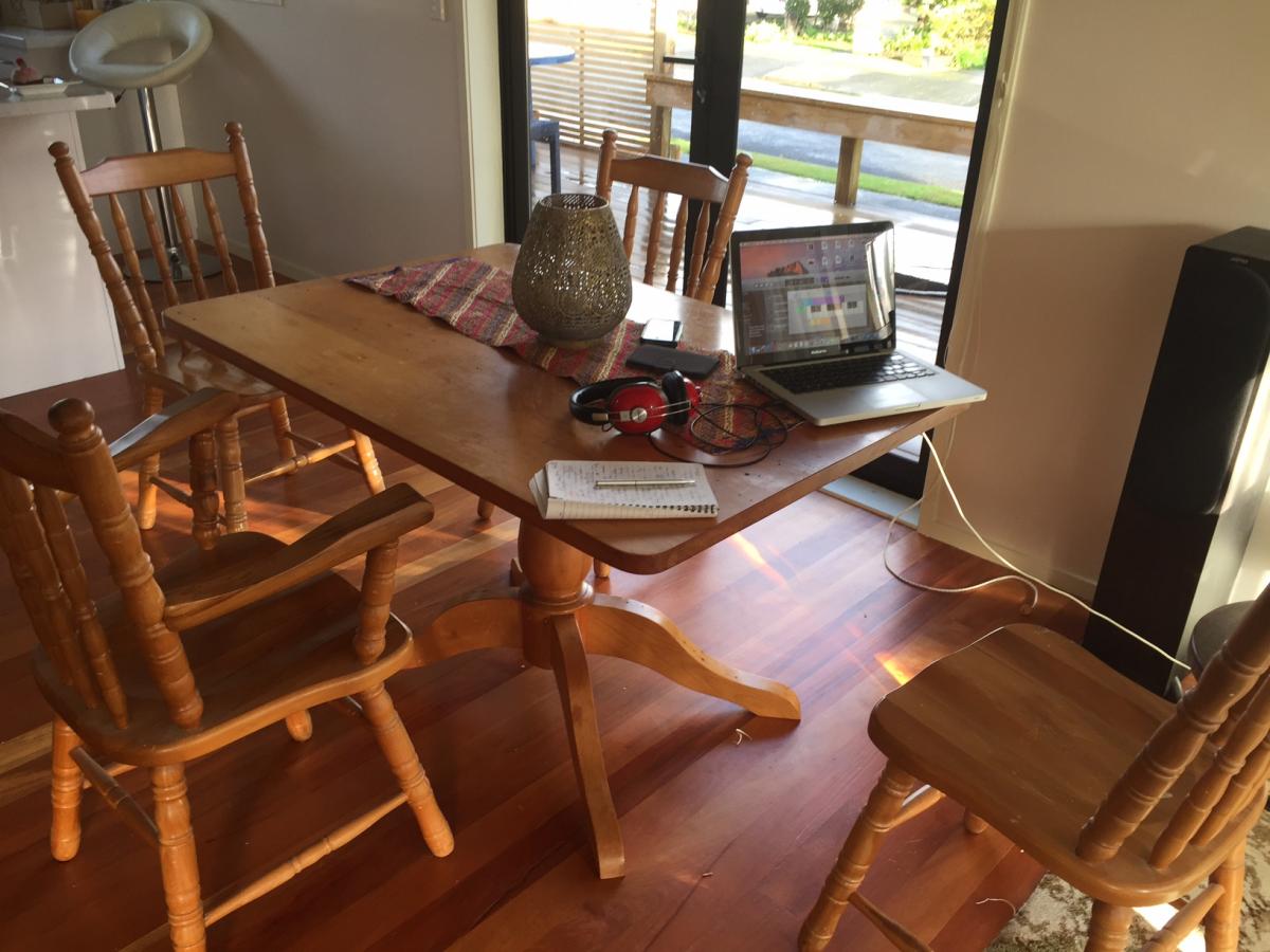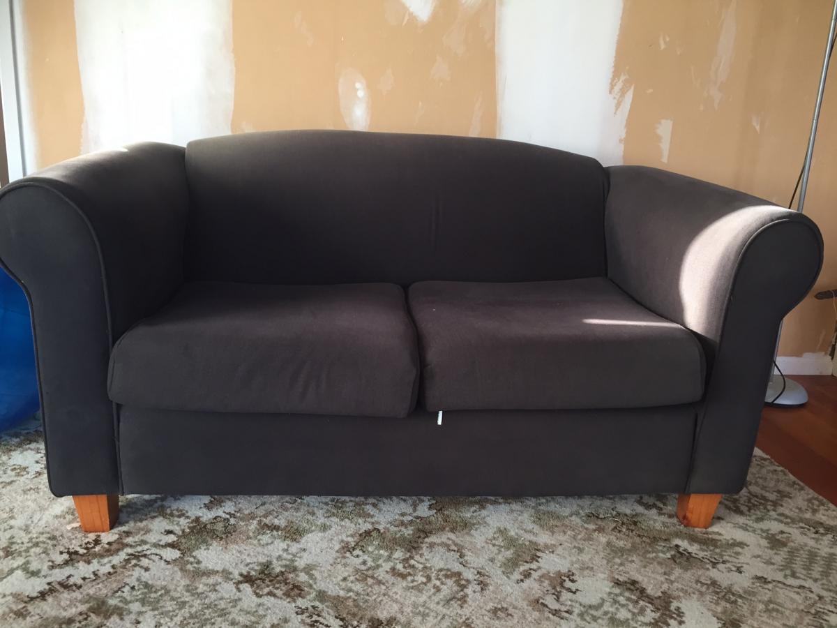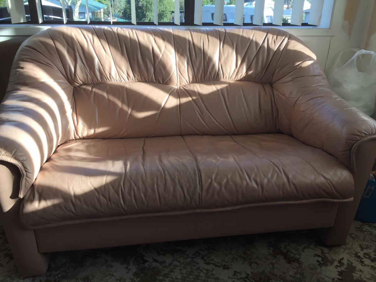 Well cared for but used - two x 2 seater couches; 1 navy fabric, 1 light pinky brown/champagne colour leather look - and a wooden table with 4 chairs (other chair has a split in the seat). Pick ups only.