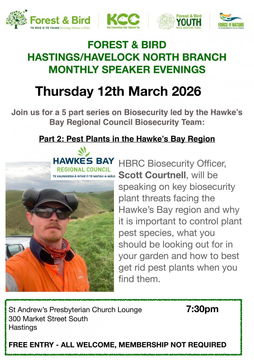 Come and hear HBRC Biodiversity Officer Scott Courtnell talk about plant pests affecting our region.
