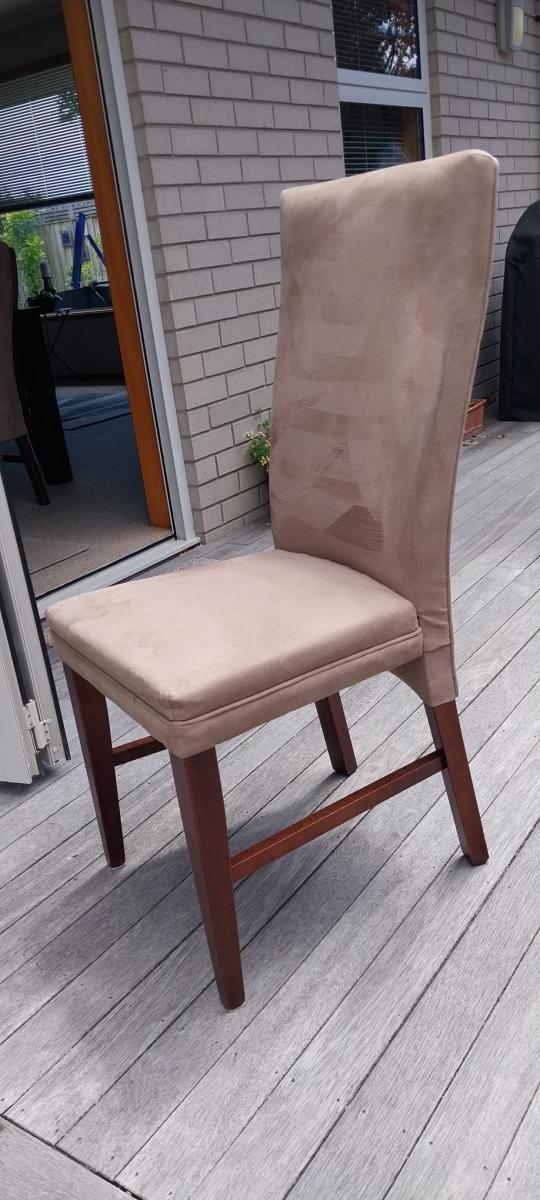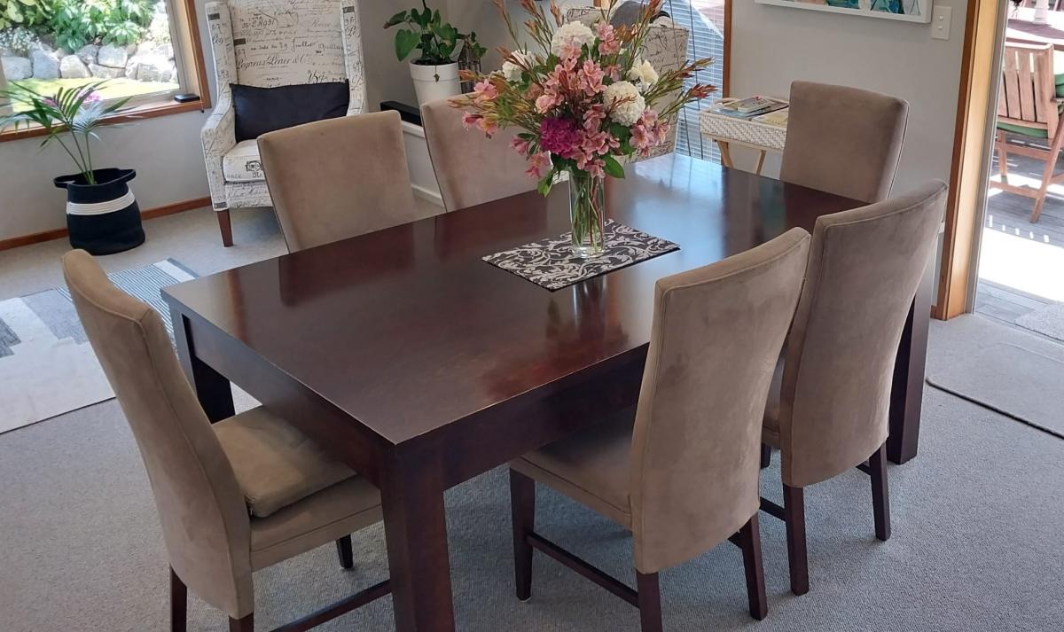 Our dinning room table with 6 taupe coloured microsuede chairs by David Shaw has outgrown us. We need to downsize. Table is made of Southland Beech. 1800 x 1100 x 760mm. Be sorry to see it go.