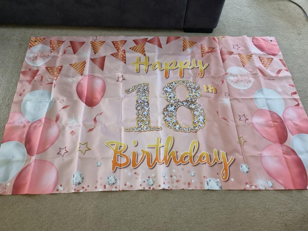 Banner measures 1700 x 1080 and has eyelets for hanging. Light canvas material