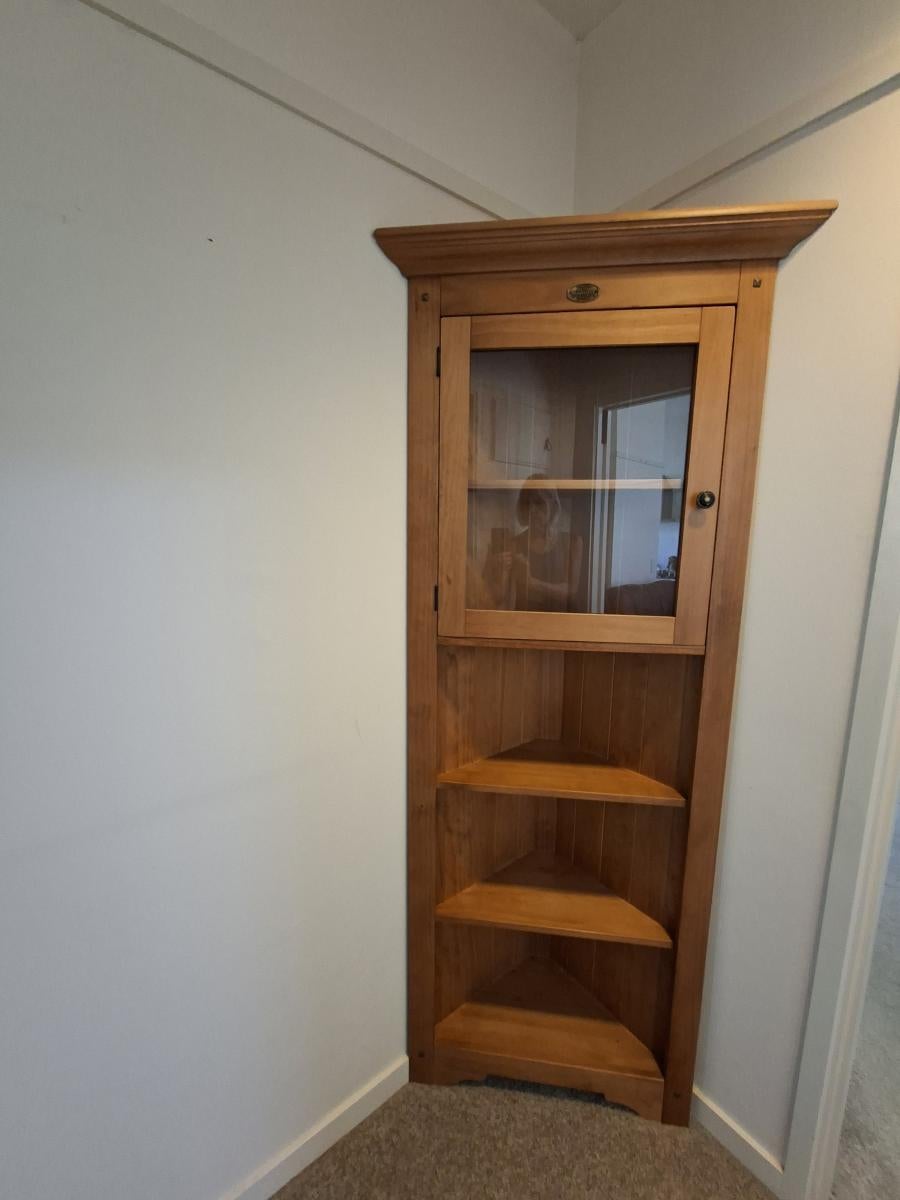 Glass cabinet at top with 3 open shelves below.