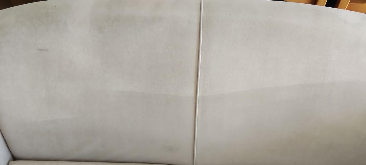 Solid and comfortable. Marks from use and one burn hole (see photo). Good heavy solid sofa. Ideal for re-cover or cover with throw.