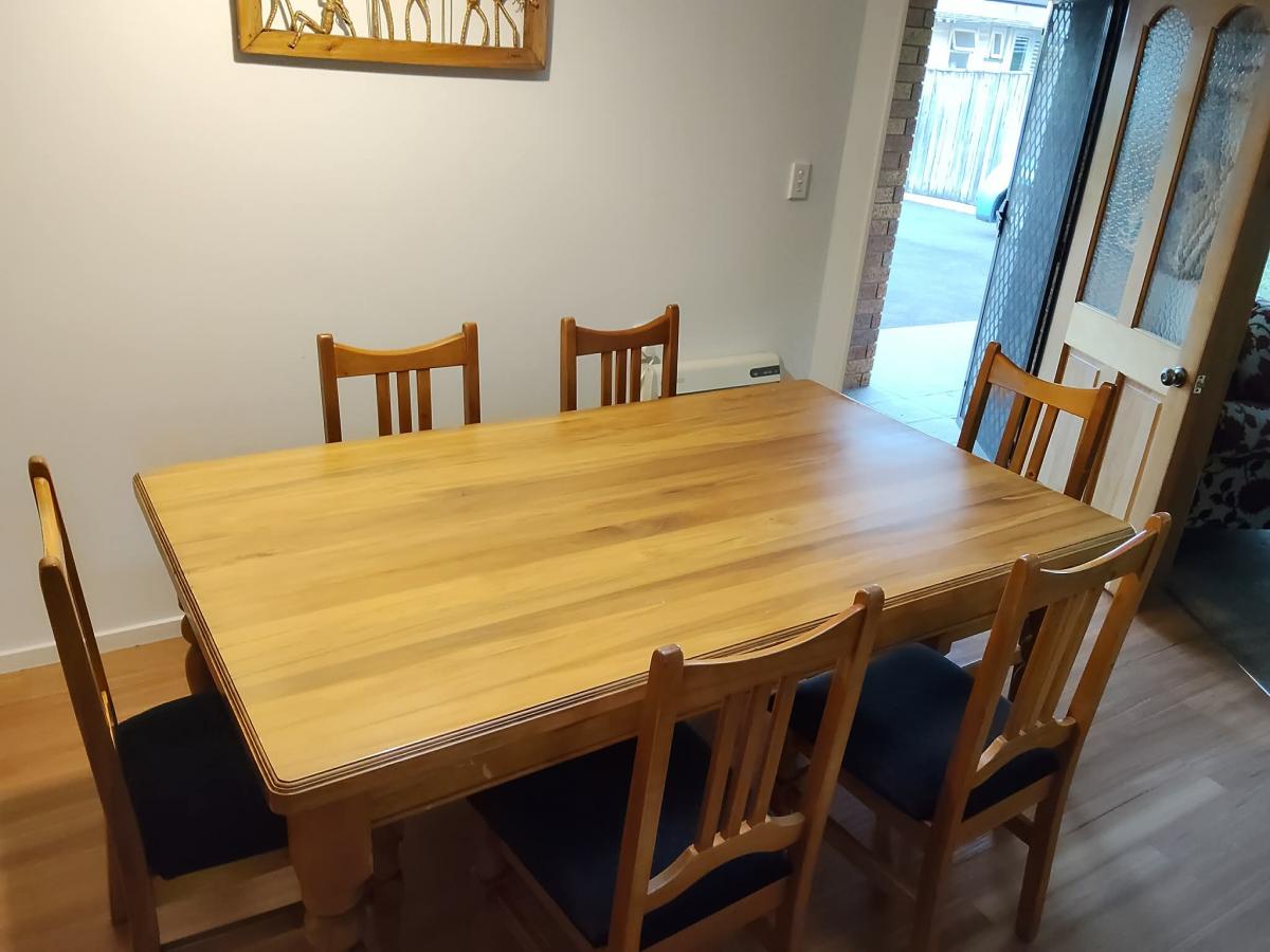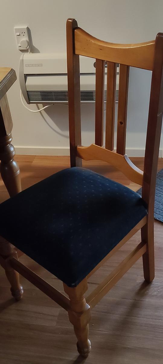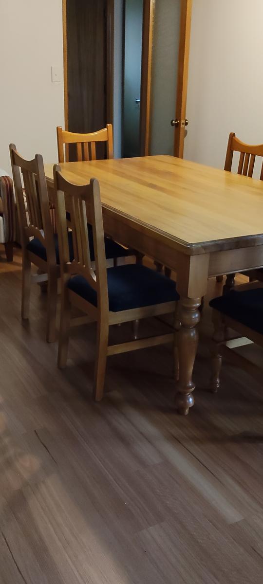 Lovely solid Wooden family table and chairs. Used but table top in good condition and seat chair cushions also in excellent condition. Does have few dings on chairs and table sides.