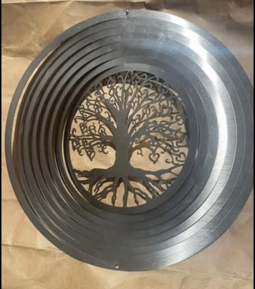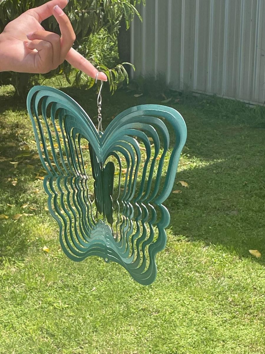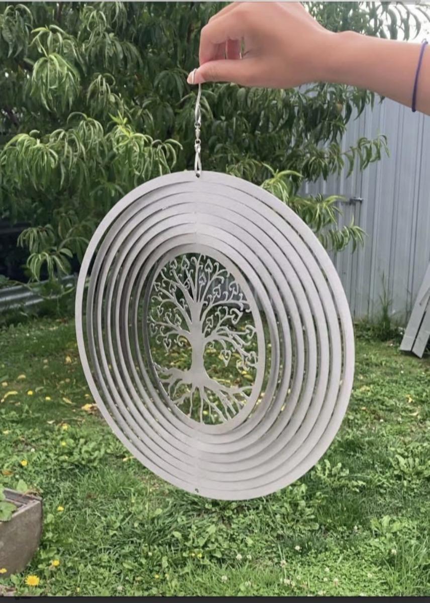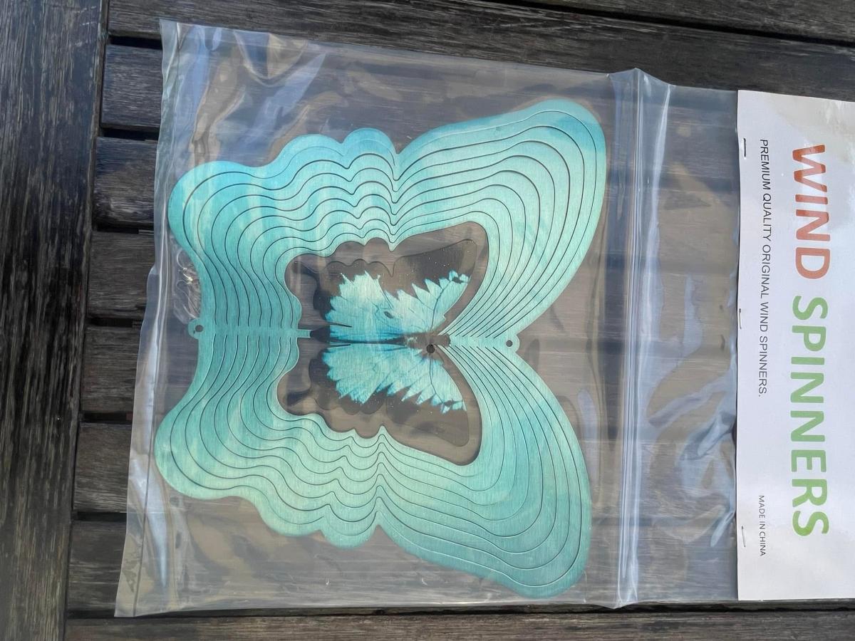 The 3D metal garden hanging wind spinner. It spins rapidly and easily with a small breeze, and adds sparkle as it spins.still in packaging