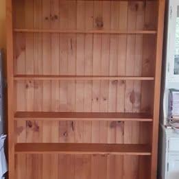 Wooden bookcase (pine?). 6 shelves - 4 adjustable, 2 fixed. Excellent condition. Small pencil mark but is rubbing off with rubber. Scratch mark on 1 shelf. Great condition. Won't fit in my new unit. 210cmH x 112cmW x 24cmD