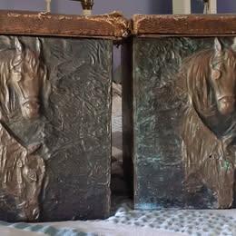 2x vintage copper (maybe brass?)embossed fireside boxes with horses heads. Need work. $60 pr