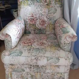 Lovely old floral armchair with slight rocking motion. Good doer upper. Has hole on cushion at front - cover with blanket. And a tear in the back.